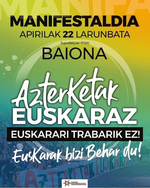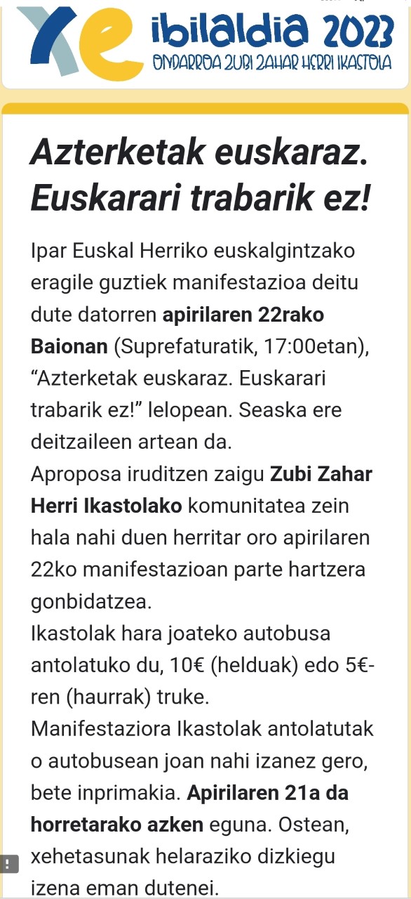 ZUBI-ZAHAR herri ikastolik hara juteko autobuse antolatuko dau, 10€ (helduk) edo 5€-ren (haurrak) truke. Iparraldeko ikaslin hizkuntz eskubidik babestu beharra dakauelako, danok bat einbirdou!