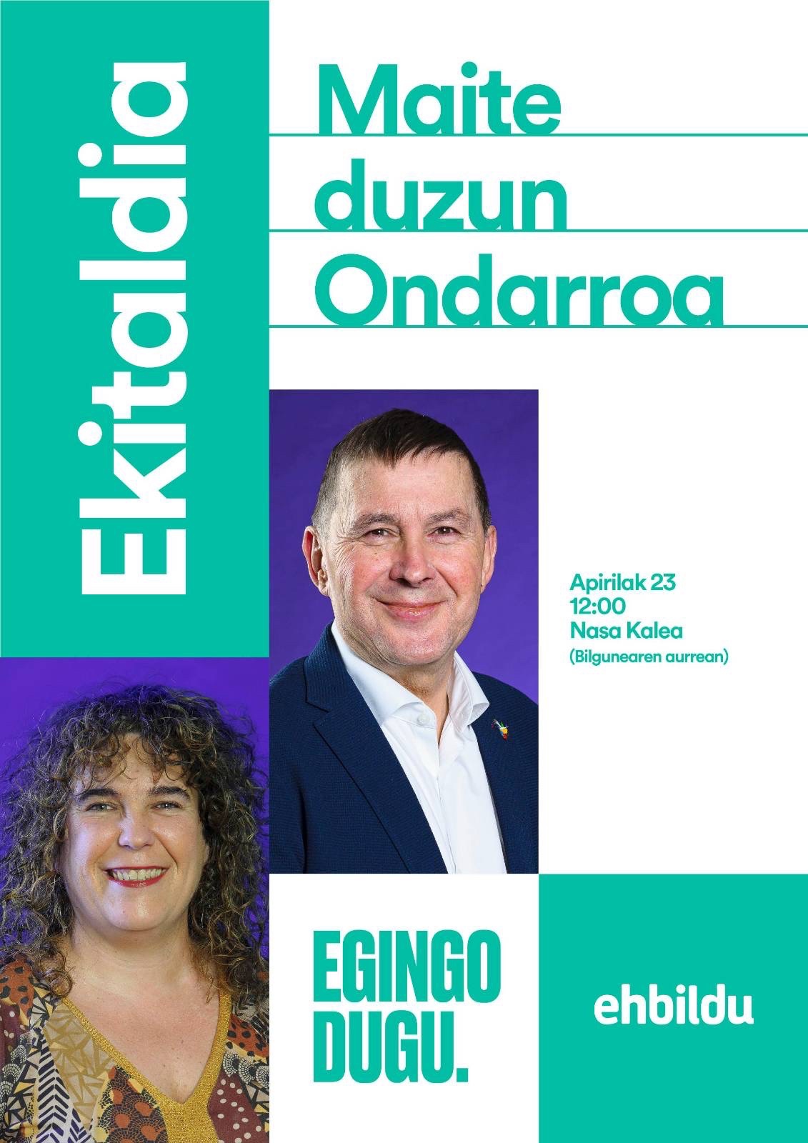 Domekan (Apirilak 23) 12:00etan, eskualde mailako zitxa berezixe dauke EH Bilduk Ondarrun. Maxatzan 28ko udal hauteskunditako zerrendaburukin ekitaldixe eingo dabe Nasa kaleko bilgunin.