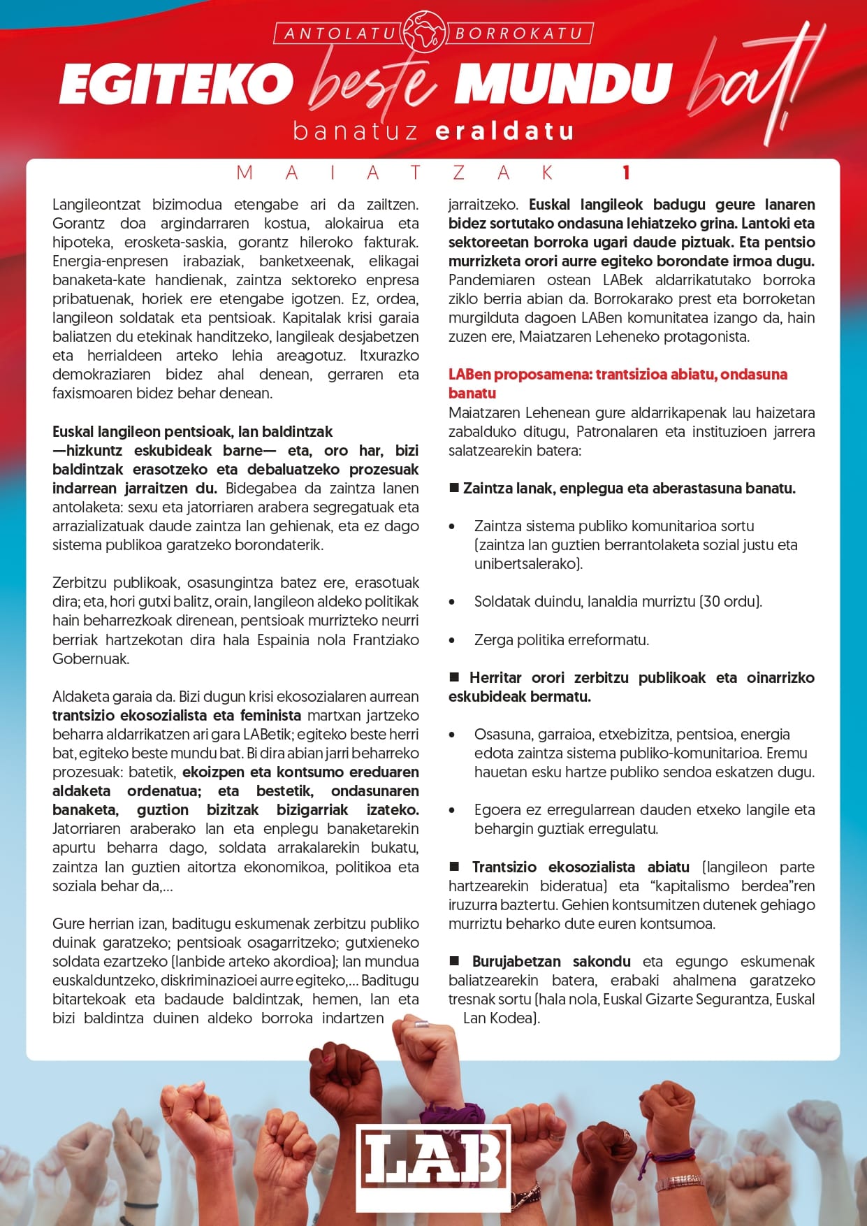 Alla da aurtengo Maiatzak 1ta ta kalea urteteko arrazoi asko jarraitzen dou eukitxen, langillintzako lan baldintza duiñak (bixik nahi dou etxea bueltatu), soldata ganorazkuk, genero desberdintxasunik ez lan tokixetan ( soldatetan ), zahartzarurako Pentsiñoi duiñak ziurtatu…