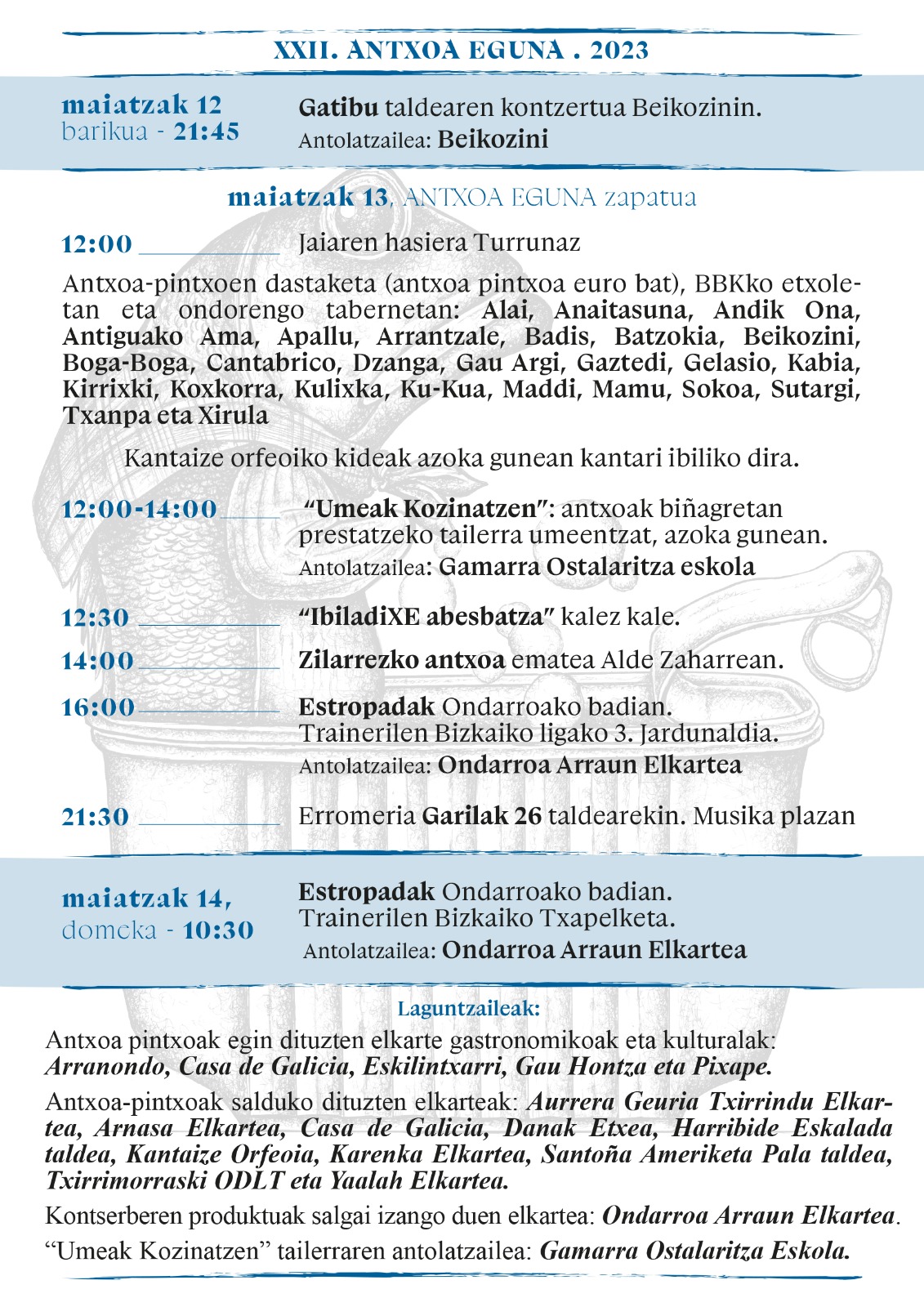 Entzun TURRUNE! badator ANTXOA egune, lelu ipinitze aurtengo jaxai. Egitarau zabala prestatu dabe egun horretako (azpixan irakurriko dozuen latxeik). Antxoi herriko aberastasunaz lotzen dou herrixan, hiru bat urtin gure kostaldetik ihes eginda euana aurten iñoizko kopuru guztik gainditzen dabil gure portun (adibidez, Maiatzeko lelengoko astin 150.000 antxoa kaja sartu dizela baieztatu dosku Kofraxatik).