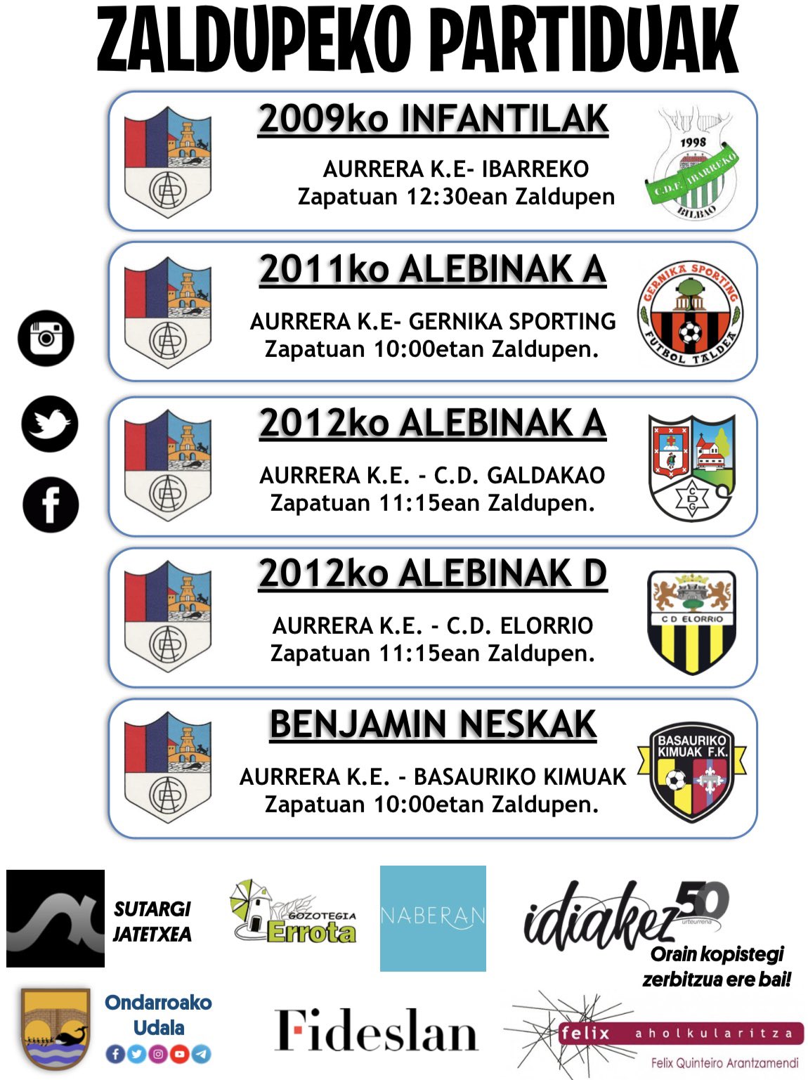 Honek diz AURRERA K.E. futbol talde desbardiñak ZALDUPE udal futbol zelaxan jokatuko dotxuen partidun egun eta ordutegixak. Aupa AURRERA TRA KA TRA!