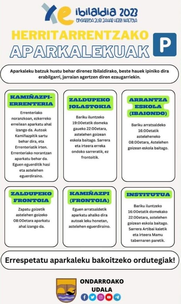 IBILALDIko egune hurreatzen dun negurrixan albistik gehitzen duz beronen ingurun. Udalak mezu hau zabaldu dau aparkalekun tokixan ingurun. Aparkaleku batzuk hustu behar dizenez, beste batzuk erabili ahalko diz. Azpixan dakazue nun eta noiztik ahalko dan aparka leku horretan.