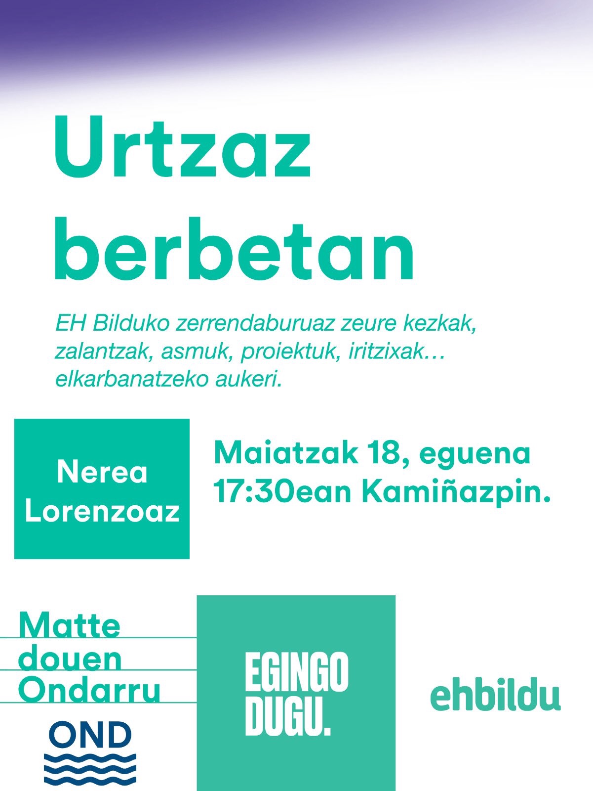 Gaur (Maxatzan 18), arratsaldeko 17:30etan kamiñazpin “Urtzaz berbetan” saiu egongo da. Eh Bildun alkategaixaz kezkak, zalantzak, proiektuk… elkarbanatzeko aukeri egongo da.