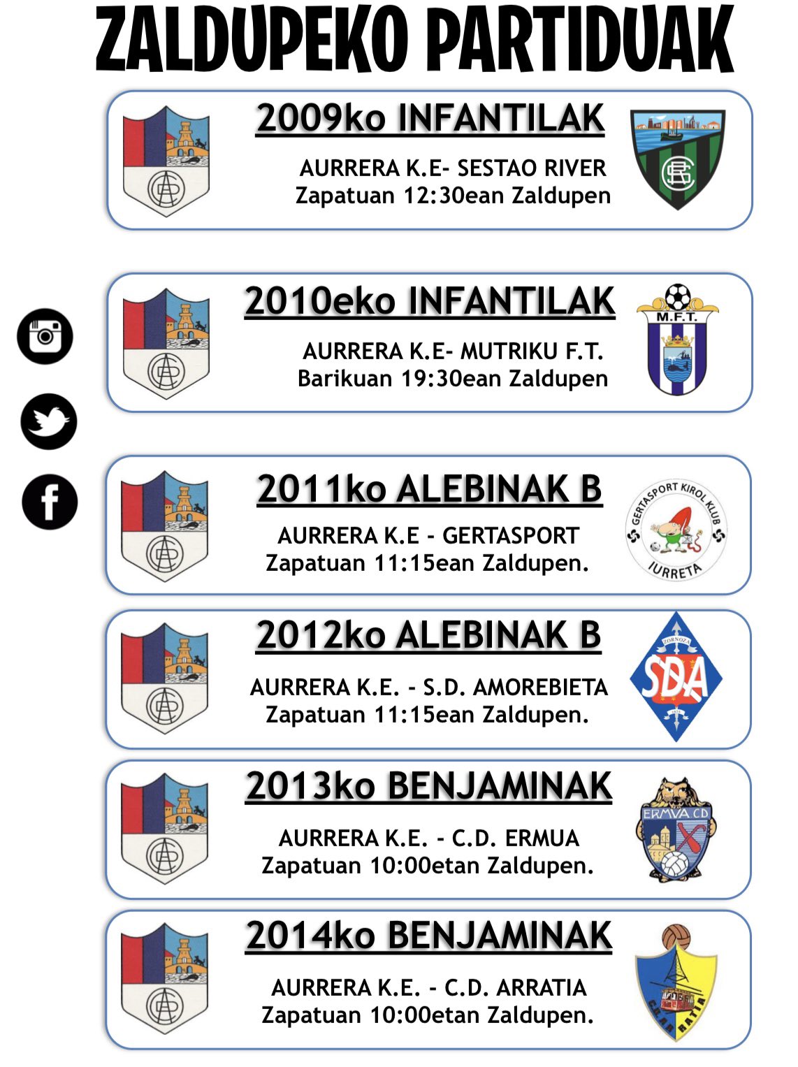 Honek diz astebukaera honetan Zaldupe udal futbol zelaxan AURRERA K. E. talde desbardiñak jokatuko dotxuen partidun egun eta ordutegixak. Aupa AURRERA tra ka tra!