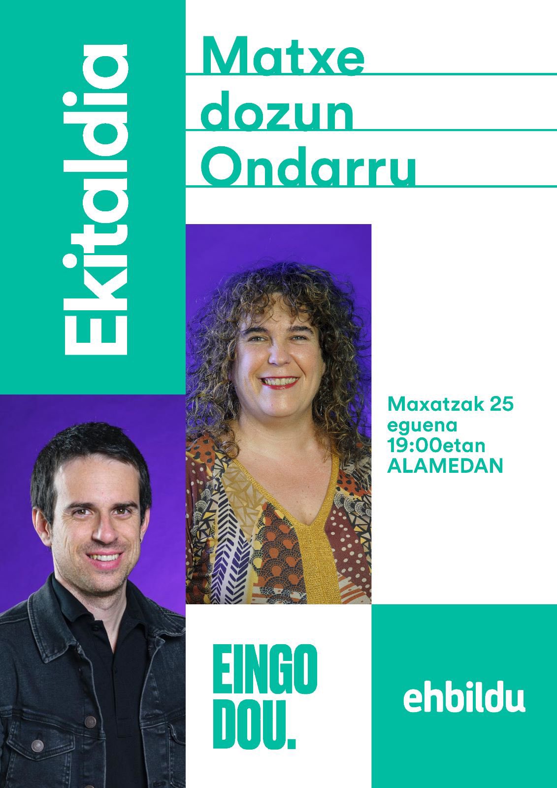 Kanpañako ekitaldi nausixe ospatuko dau Ondarruko EH Bilduk gaur (eguena 25) Alamedan arratsaldeko 7retan. Bertan PELLO OTXANDIANO KANPO, URTZA ALKORTA ARRIZABALAGA ta zerrendako kidik eongo diz. Ta domekan danok EH Bilduai botu emotea!
