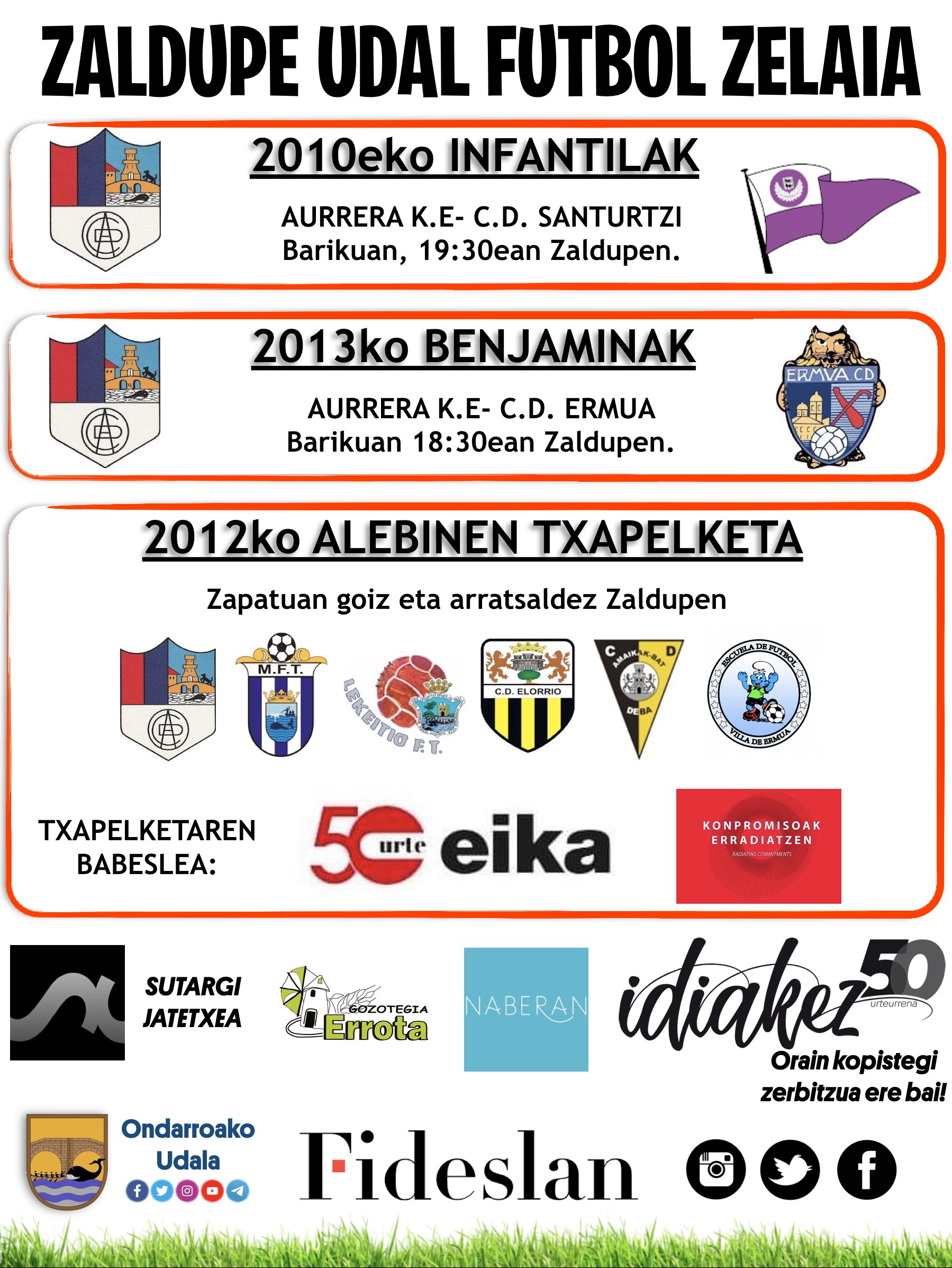 Honek diz astebukaera honetan Zaldupe udal futbol zelaxan AURRERAko talde desbardiñak jokatuko dotxuen partidun egun eta ordutegixak.