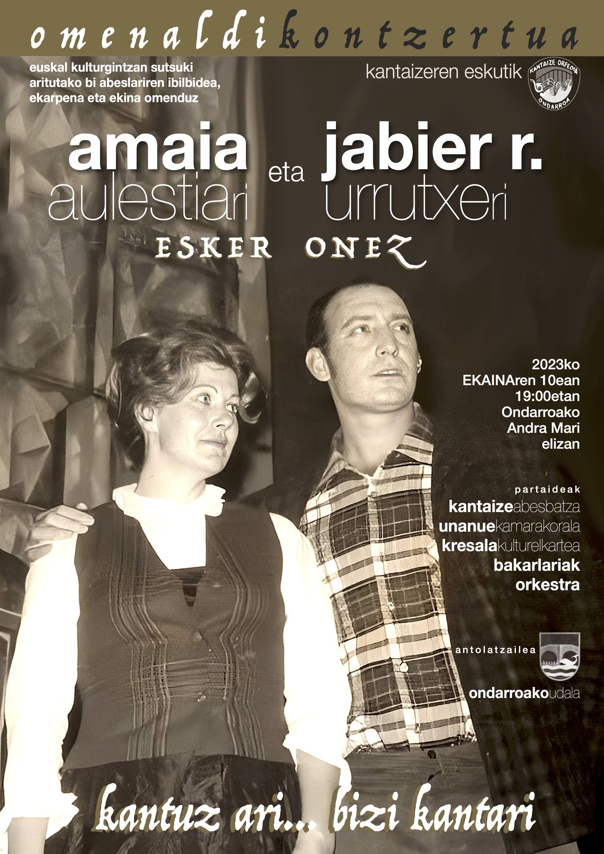 Ondarru beti ixan da abeslai onan sorleku eta AMAIA eta URRUTXE diz adibideik argixena. Ata daben kartelak esaten daben latxeik: Euskal kulturgintzan sutsuki aritutako bi abeskariren ibilbidea, ekarpena eta ekina omenduz, esker ona emoteko omenaldi kontzertu antolatu dabe Andra Mari elixan ekainak 10 eako (zapatu) arratsaldeko 7 retatik aurrea, KANTUZ ARI…BIZI KANTARI lelopin. Kantaize abesbatza, Unanue kamara korala, Kresala kultur elkarti, bakarlariak orkestra ixango diz parte hartuko daben taldik. Hurreatu zeu be babesa emotea entzule lez, gu han eongo gaz!