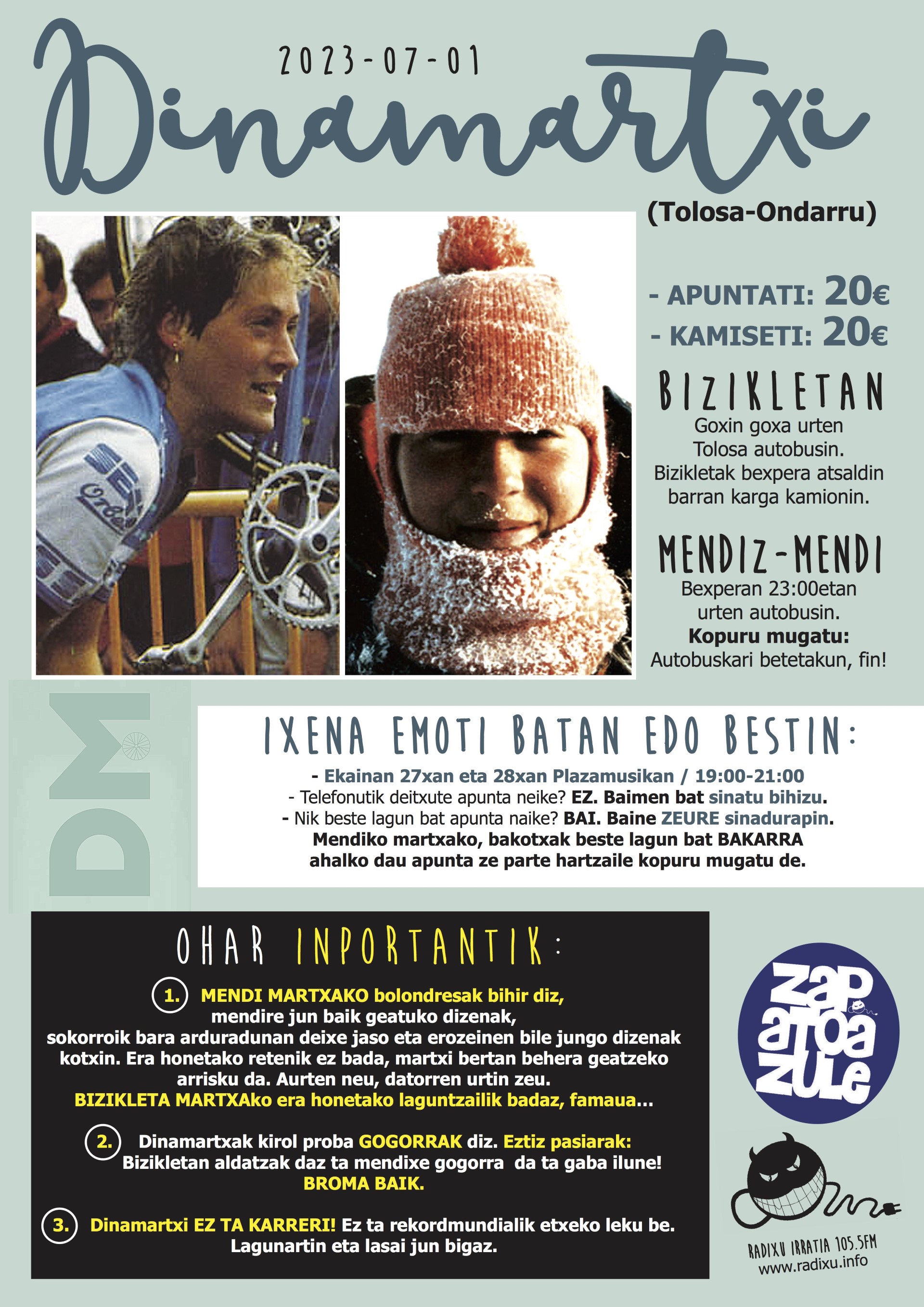 Aurkeztu dabe aurtengo DINAMARTXI (Uztailak 1) ta jenti bizikletak armaxutik ataten hasi de daneako. Urtin tzir nun danik be ez dakixenak ta on Marino Lejarretan kamiseti jantzixe ikusten douz, beste batek bizikleta elektrikun ei dule bera be esan dosku, bizikleteroz de postal deitzen dotzau guk.