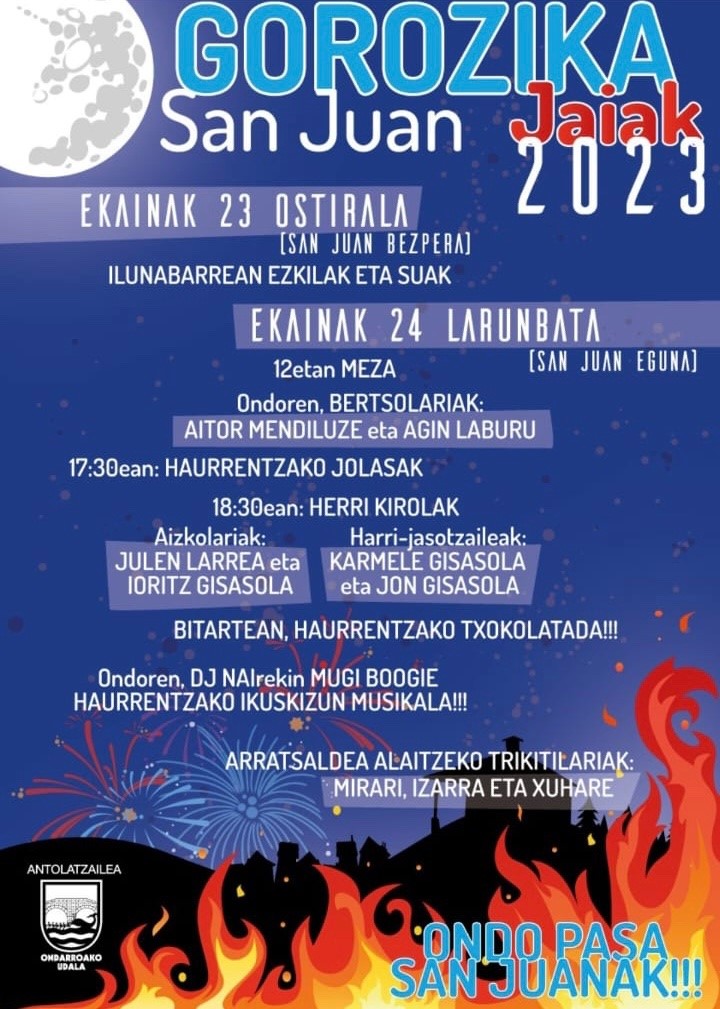 Argitaratu eta zabaldu dabe aurtengo GOROZIKA ko jaxetako kartela. Bertsolaxak, herri kirolak, umintzako txokolatadi, trikitrilaxak eta illuntzeako Dj xe gozatzeko aukeri eukikou. Ohitxuriai jarraitxute herrittar pillu be hurreatuko dala zihur gaz. Ondo pasa SAN JUANak!