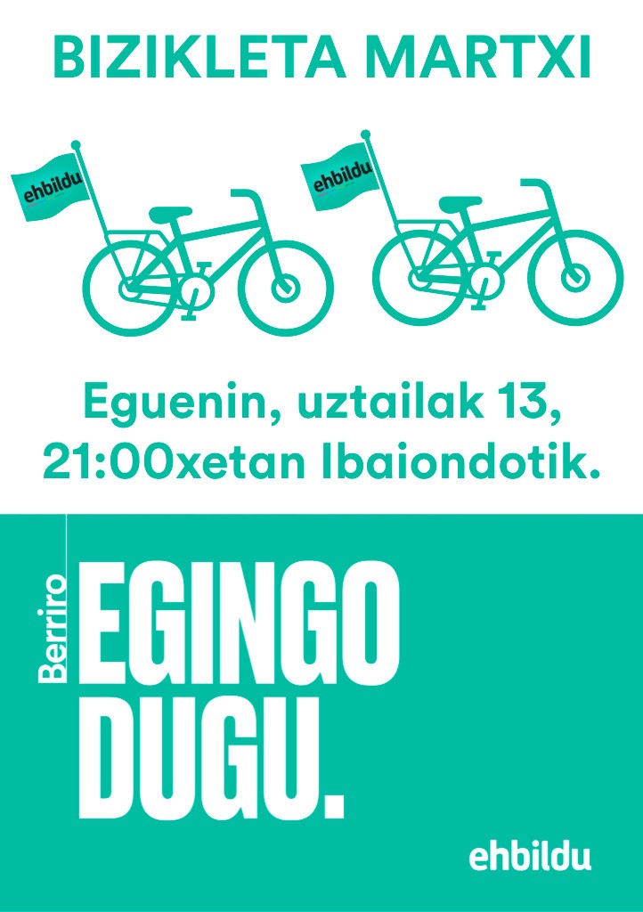 Ta ongo eguenin (Uzatailak 13) Bizikleta martxa juteko deixe zabaldu dabe, Ibaiondotik urtengo dabena illuntzeko 9 xetan. Kantik esaten daben latxeik, itxosoz da liorrez…Bozkatu EH Bildu! (miñe emotetzen bozki)