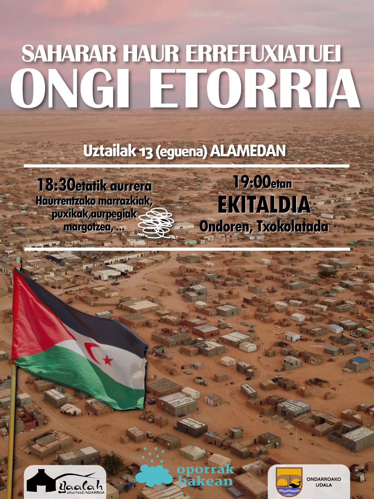 Eguen honetan, (Uztailak 13) harrera ekitaldixe da antolatute 18:30etatik aurrea Alamedan. Bertan Yaalah elkarteko kidik, Udal ordezkarixak eta herritxarrok harreri eingo dotsau Saharar umiai. Txirrimorraskin estutik marrazkixak etxeko txoku, arpexak pintxateko aukeri… egongo da eta ekitaldixe eta gero txokolatadi!