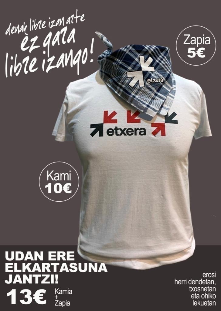 Beste behin be gaur illuntzeko 8 retan urtengo dau PRESO ta IHESLAXAN etxeratzin aldeko enkarteladik Alde Zaharretik. Horretaz gain, gaur arratsaldeko 7 retan ELKARTASUNEzko mahaixe ipiniko dabe Kofrai Zaharreko ate parin, bertan Jantzixak eongo diz salgai (kamisetak et pañueluk) laguntza ekonomiku be sostengatzeko era bat dalako. Hurreatu eta erosi udako kamiseti eta pañuelo.