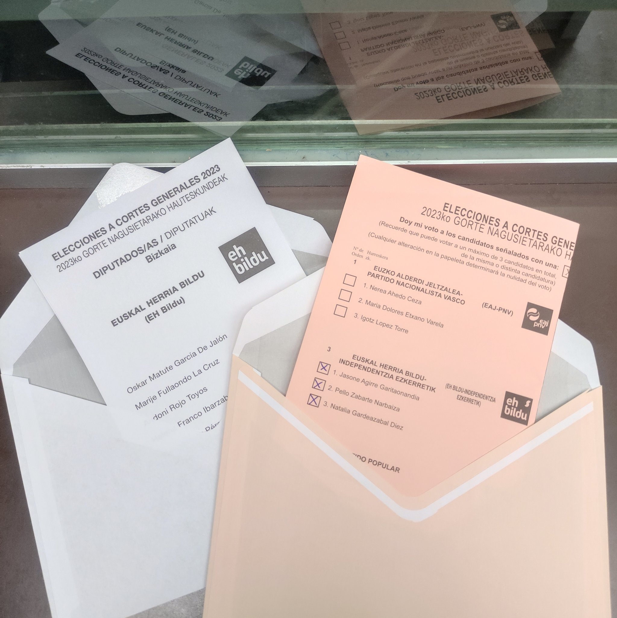 Gogoratu gaur hauteskunde egune dala ta gerua ta gexa gazela ezkertiar eta abertzalin aldeko bozki botaten douenok. Ez ahaztu bi boto paper sartu birdouzela hautesontzixetan, bata senaturako (sepia koloreku) eta besti kongresurako (sobre zurixin). Botuk bihir ixan ezkeo, EH Bilgunin eukikozue egun guztin tzir. Itxura guzti dauke olatu alde dakauela, emon bultzadi zeuk be ta bozkatu EH Bildu! Berbakuk gazelako eta esaten douena etxen douelako! Antifaxistak beti!