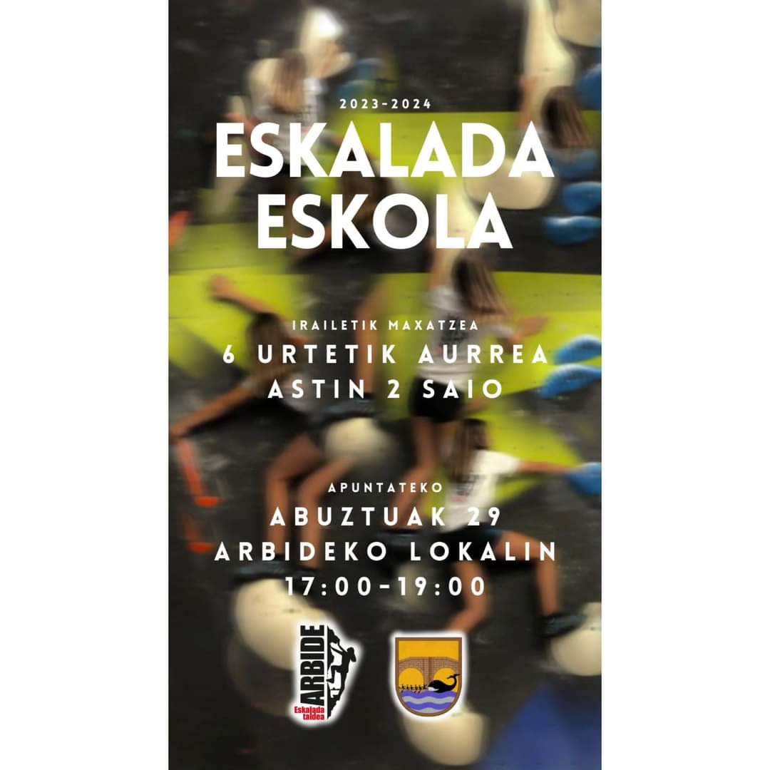 Eskalada eskolako ikastaruk hasikori irailin! Nahibazu apunta ABUZTUAK 29an ARBIDEKO LOKALIN eongoa 17:00 – 19:00 bitxartin! 6 urtetik aurreakuntzako eta astin saio bi. Anima eta ez galdu aukerii!