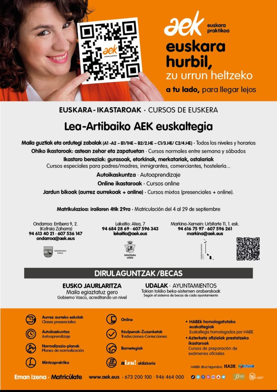 Ezautzezue baten bat Euskeri ikasi edo landu nahi dabena? Hamen dakazue 2023/2024 rako Lea_Artibaiko A.E.K.k ata daben ikastarun kartela. Ze eratako ikastaruk emongo daben, zelako taldintzako, online ikastaruk, noiz eta nun ahal dan matrikula, diru laguntzak eukiko dozuenok noa bideratu…. EUSKARA HURBIL, ZU URRUN KELTZEKO leluaz! Emon ixena edo anima dudan dan edozein!