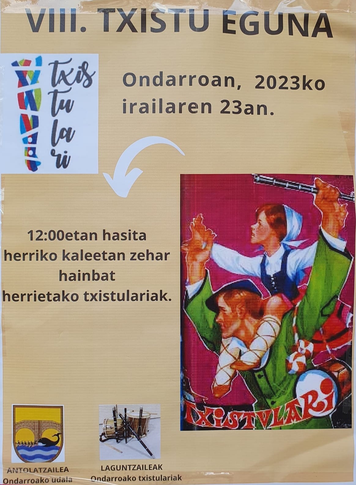 TXISTUn doinu matxe badozue, Irailak 23 an (zapatu) herrixan VIII.TXISTU egune ospatuko dala jakin arazi dosku. Hainbat herrixetako txistulaxak batuko diz herrixan eta eguerdiko 12 xetatik aurrea herriko kalitan tzir euran doiñu-trebetasunak erakutzikozku.