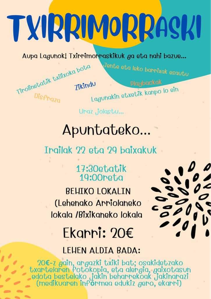 Nahizu TXIRRIMORRASKIko partaidi ixan? Irailan 29 xan arratsaldeko 5:30 tatik 7 reta BIXIKANeko lokalin ahalko dozue ixena emon. Kartelin agertzen dizen baldintzak bete bihir dozue: 20 euro, argazki txiki bat, osakidetzako txartelan fotokopixi eta gaixotasunen bat euki ezkeo medikun informeren bat.