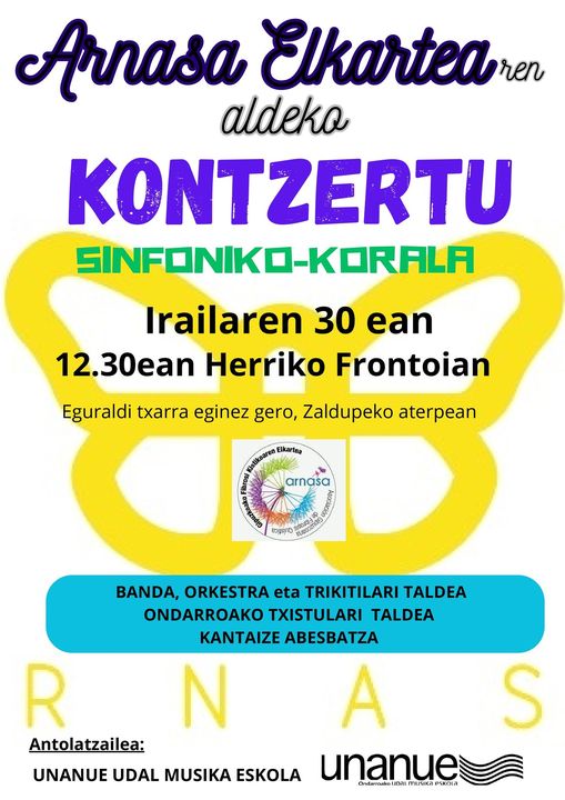 Ongo zapatun eguerdiko 12:30 xetan ezindou galdu herriko Frontoin eongo dan kontzertu SINFONIKO-KORALA, ARNASA elkartin alde UNANUE udal musika eskolik antolatute. Bertan parte hartuko dabe, KANTAIZE abesbatzak, Bandik, Trikitrilai taldik, Txistuali taldik eta Orkestrik.