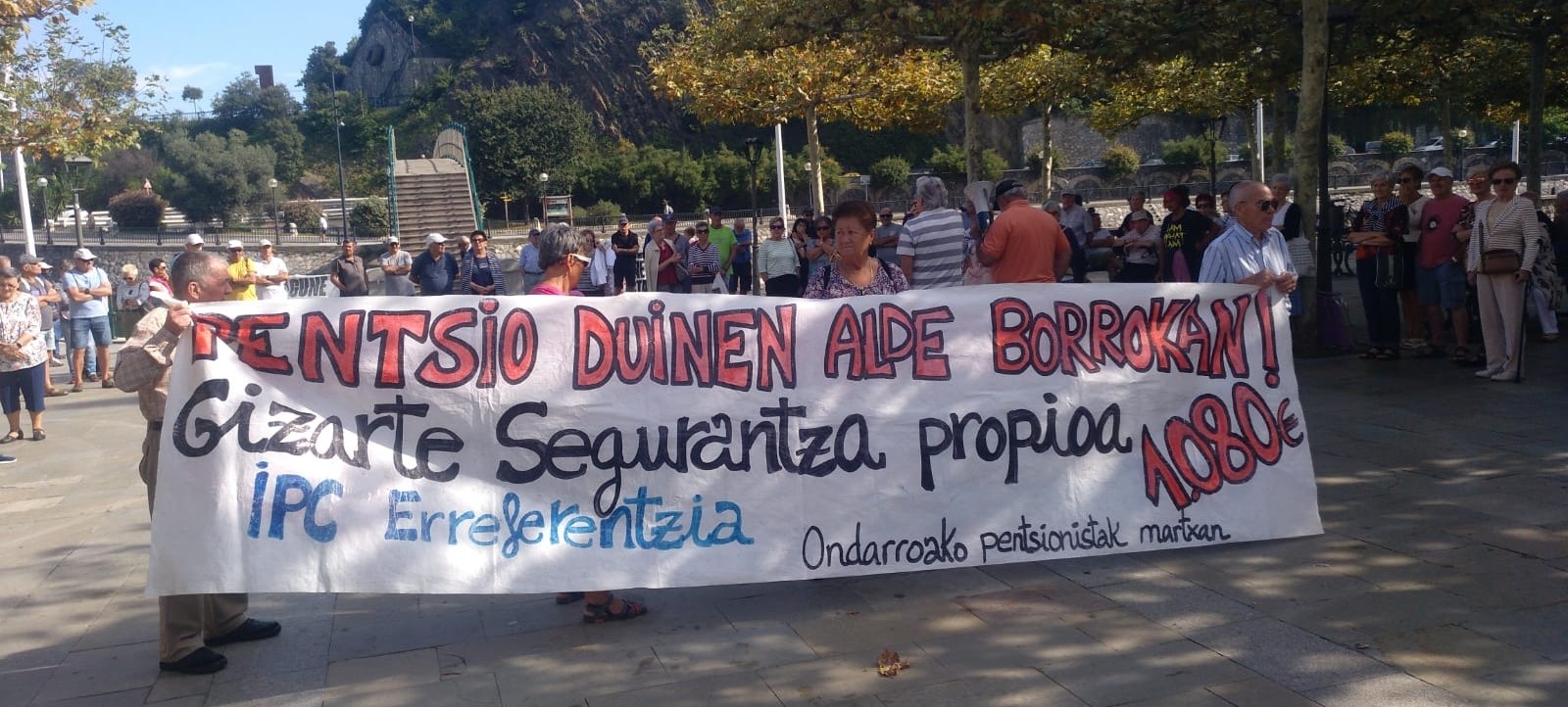 Alamedan batu diz gaur be herriko PENTSIONISTAK pankarta atzin DANON eskubide sozialak eskatzen, PENTSIÑOI DUIÑAK eta BERTOKO GIZARTE SEGURANTZI. Antolakuntzatik esan doskun latxeik gaur 145 lagun batu eidiz eta datorren astelehenin be bertan eongo dizela esanaz amatxu dabe gaurko ekimena. Jo ta Ke LORTU ARTE!