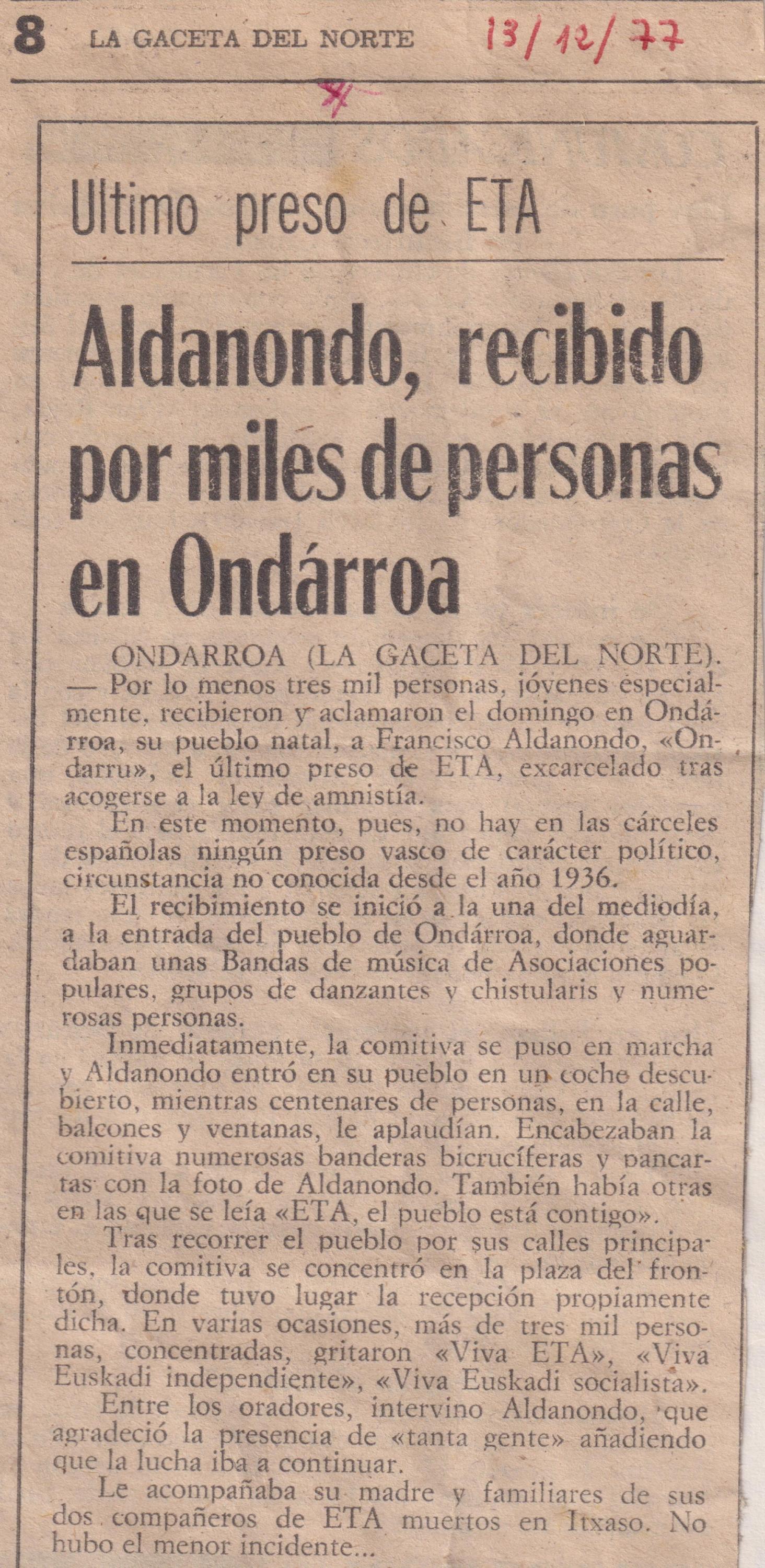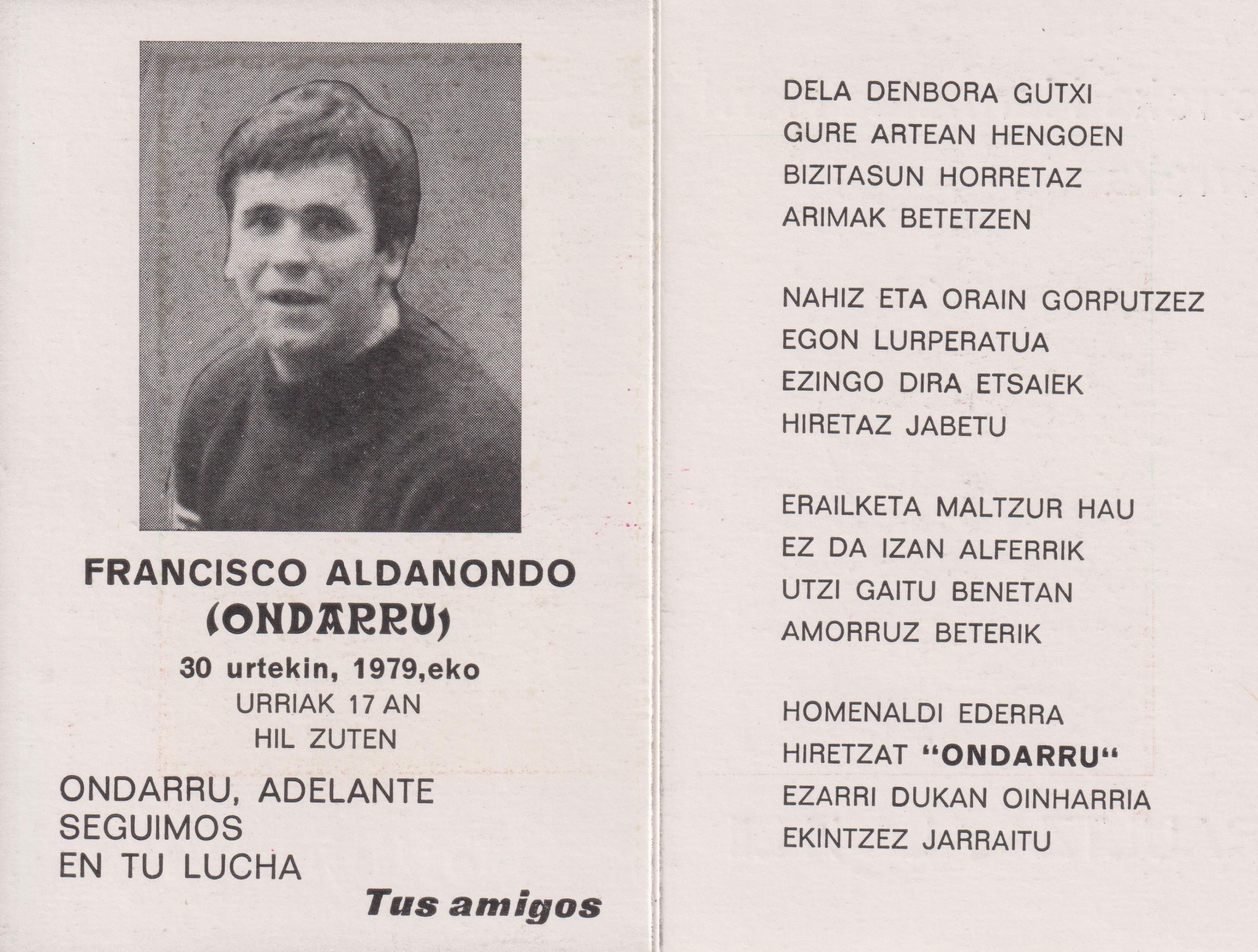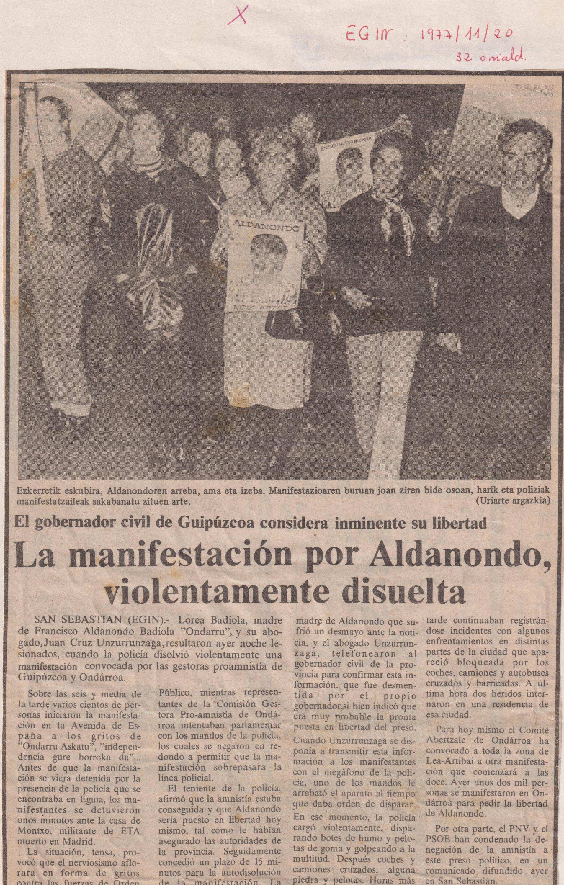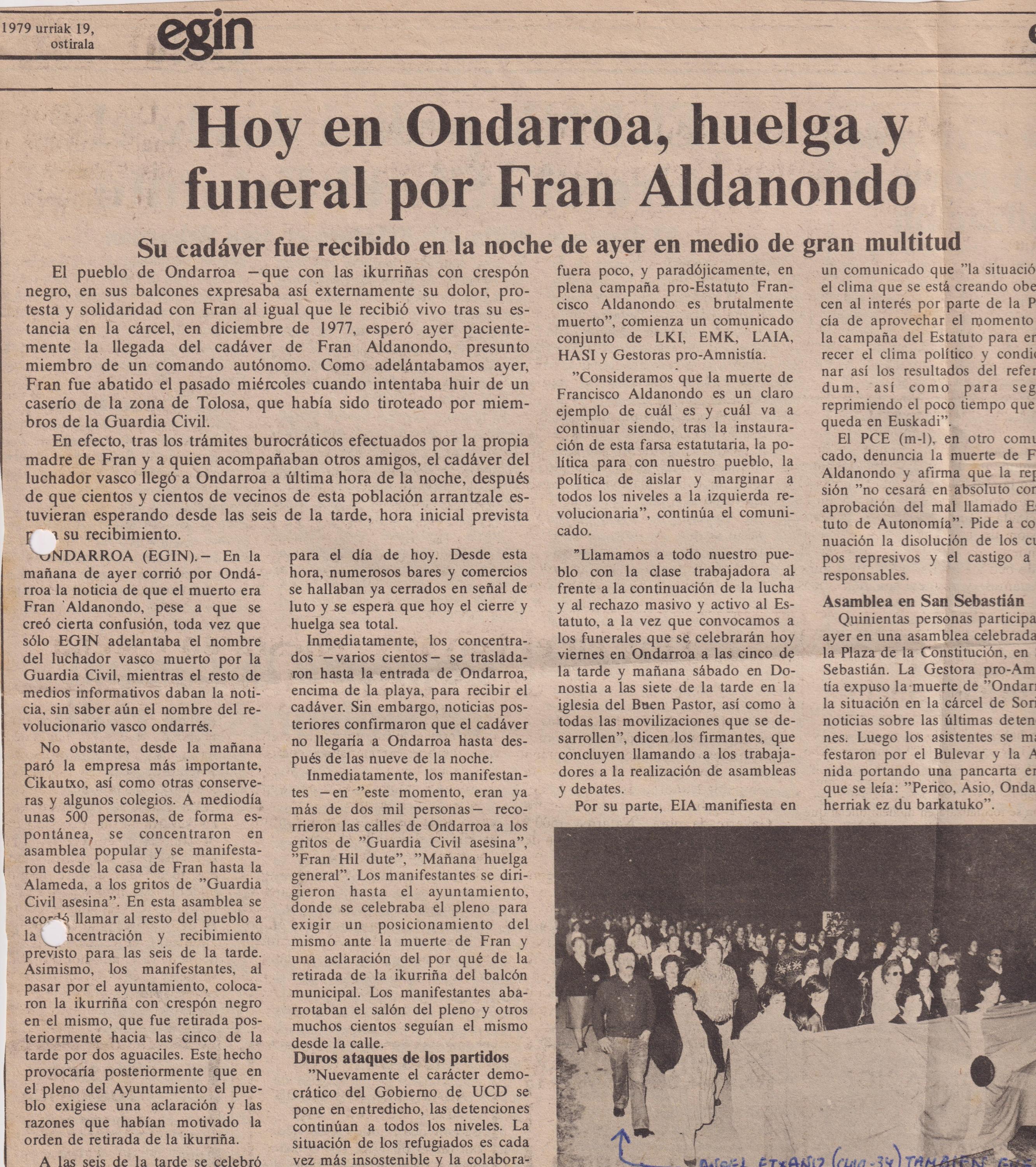 1977ko sasi amnistiaren azken preso politikoa izan zen Fran. Urte bereko azaroaren 13ko Egin egunkariko izenburuetara ekarri zituzten horrela bere amaren hitzak “La amnistía que no llega ¿Por qué no liberan a Fran Aldarondo?”