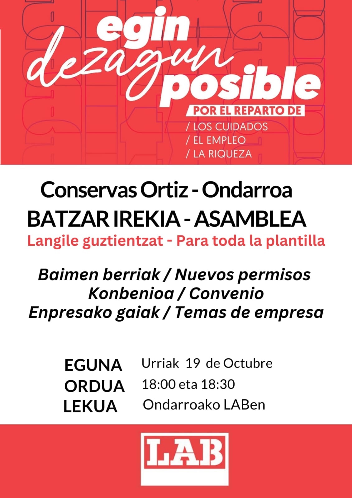 Batzar zabala egingo dabe ongoxe eguenin (U-19) Ortiz enpresako bihargiñak arratsaldeko 6 retan L.a.b. sindikatuko egoitzan. Gai ordenan: Konbenixu eta enpresin inguruko gaxak. Hurreatu batzarrea Ortizeneko langille guztioi dagokigun gaxak aztertzea.