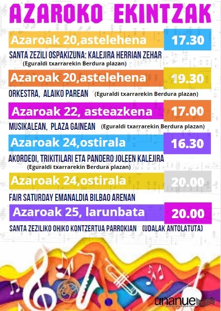 UNANUE udal musika eskolatik bixalduzku Azaruntzir entzun ahal ixango douzen emanaldixan egitarau. Gogoratu birdou tartin Santa Zezilin ospakizune eukikouela, musikarixan egune. Gozatu euran doiñukin!