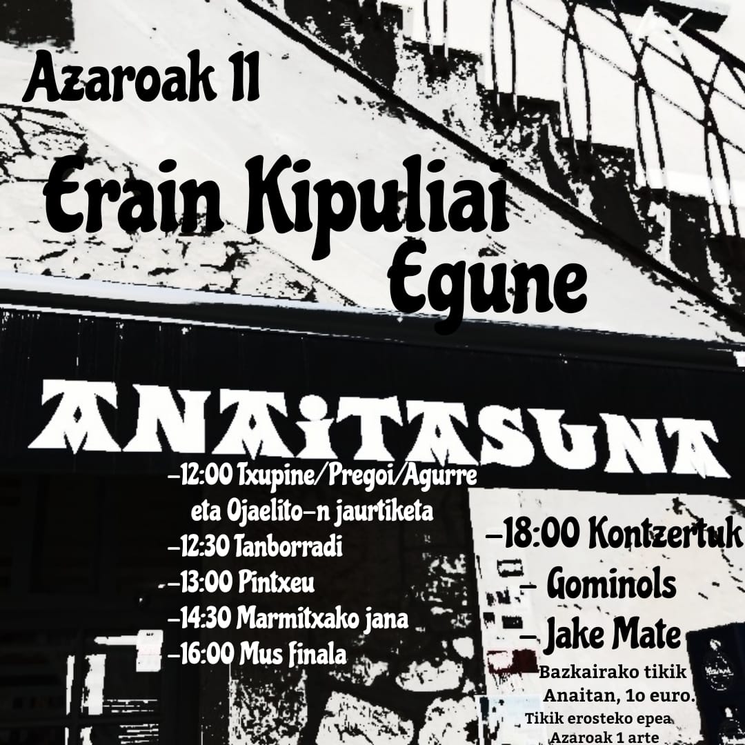 ANAITASUNA tabernako peñik egun berezixe ospatuko dau ongoxe zapatun egun guztin tzir. Pregoiaz hasi, tanborradiaz jarraitxu pintxeue ondoren marmitxako jana bazkatxako mus txapelketi aisialdirako eta kontzertuk amaierako. Hurreatu eta gozatu egunaz.