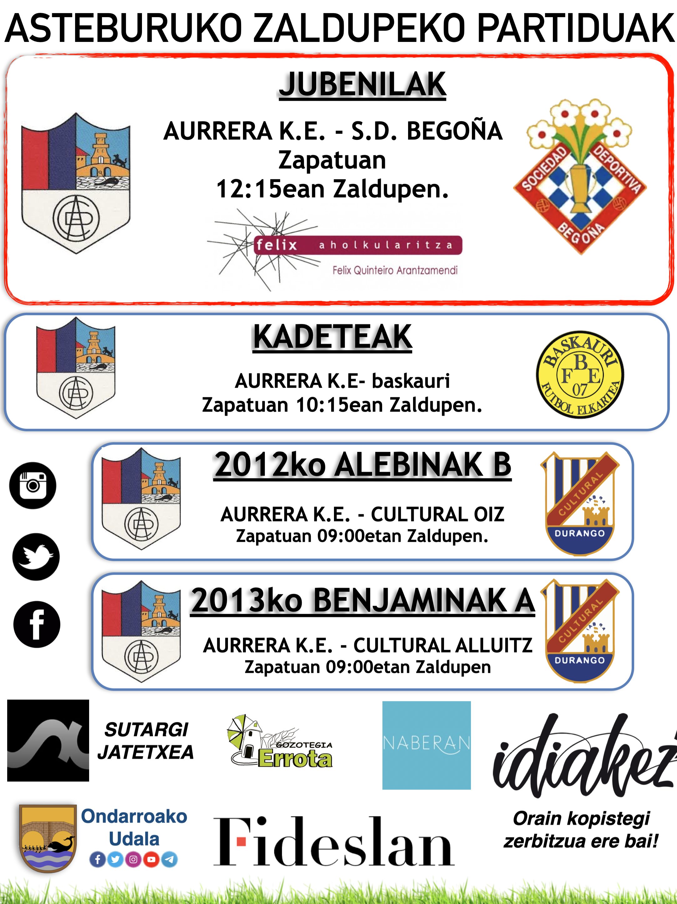 Honek diz astebukaera honetan Zaldupe udal futbol zelaxan AURRERA K.E. talde desbardiñak jokatuko dotxuen partidun egun eta ordutegixak.