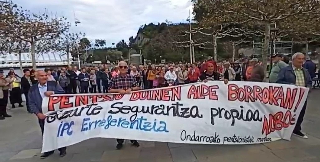 Beste behin be Alamedan batu diz herriko PENTSIONISTAK 12xak puntun pankarta atzin, PENTSIÑOI DUIÑAK (1.080 euro gitxieneku pertsonako), GIZARTE SEGURANTZA PROPIXU eta GENERO ARRAKALAK EZABATZI diz eskakizun nagusixak. Gaur 165 lagun batu dizela esazku antolakuntzatik tartin alkati eta zinegotzixak. Datorren astelehenin be bertan eongo eidiz esanaz amatxu dabe gaurko ekitaldixe. Jo ta Ke LORTU ARTE!