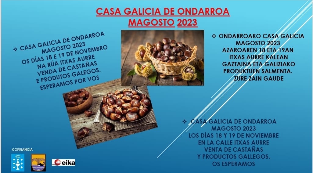 Zer dan MAGOSTO galdetukozue askorek, MAGOSTO jatorri zeltako jai bat da, uda amaieri eta negun hasieri ospatzen dabe Kantauri aldeko herri askorek tartin Galleguk. Kastañan bilketiaz lotzen da eta kastañak erreteko erabiltzen dan suan ingurun batzen diz herrittarrak alkarreaz jateko. Ondarruko Casa Galiciak ospakizun hau herrire ekarri dau eta hori dala ta Azaroak 18 eta 19 xan Itsasaurreko plazan Gaztaña eta Galiziako produktun salmentak eingo dau. Hurreatu eta gozatu!