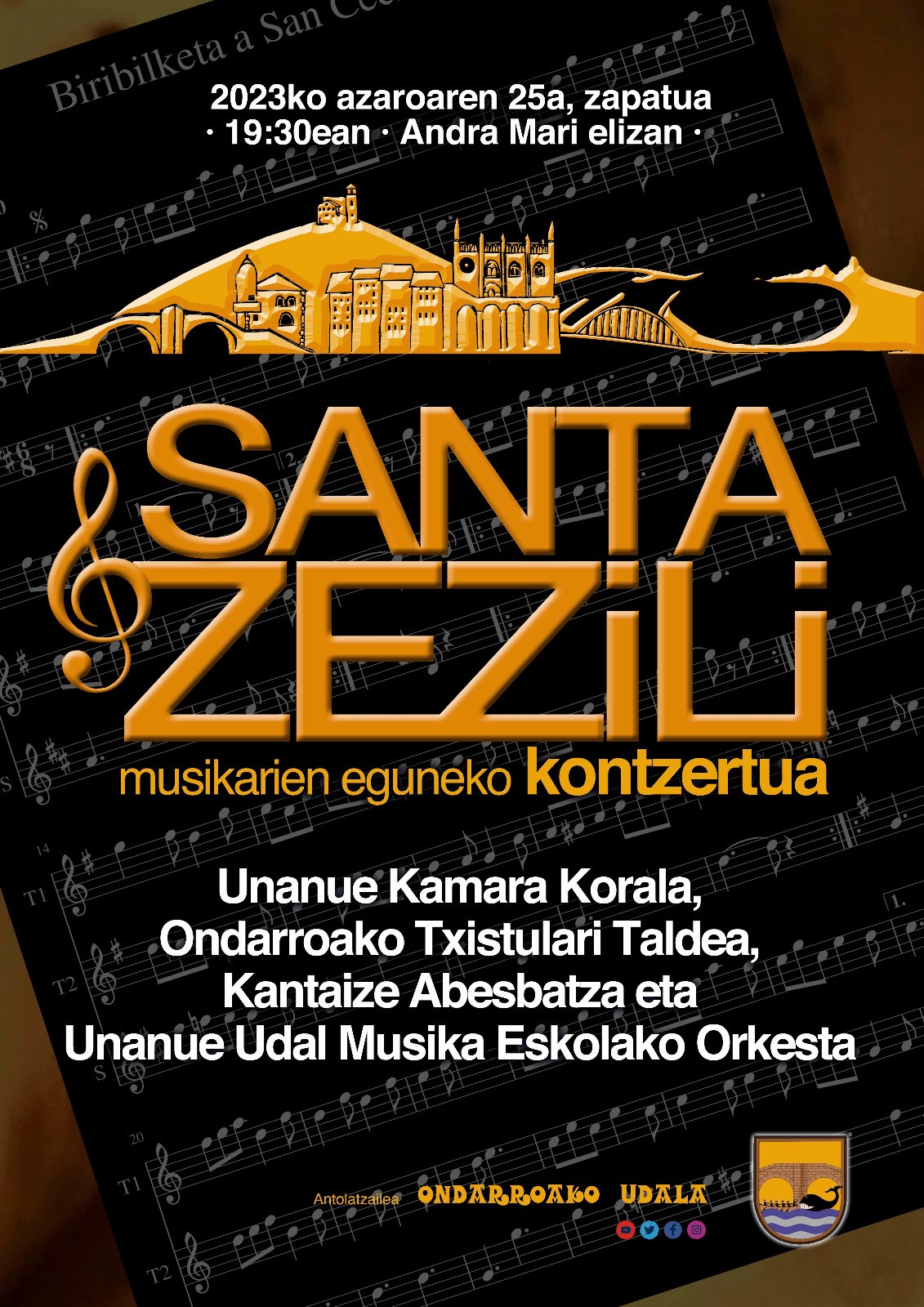 Aste honetan musikaxak daz gorenin, SANTA ZEZILIko ospakizunak dizela ta. Ta amaiera borobille emoteko Kontzertu antolatu dabe ongoxe zapaturako Andra Mari elixan arratsaldeko 7:30 xetan hasiko dana. Bertan besteak beste talde honek hartuko dabe parte: Unanue Kamara koralak, herriko txistulai taldik, Kantaize abesbatzak eta Unanue udal musika eskolako orkestak. Musiki gustoku badozu etorri zeube eta gozatu belarrixak.