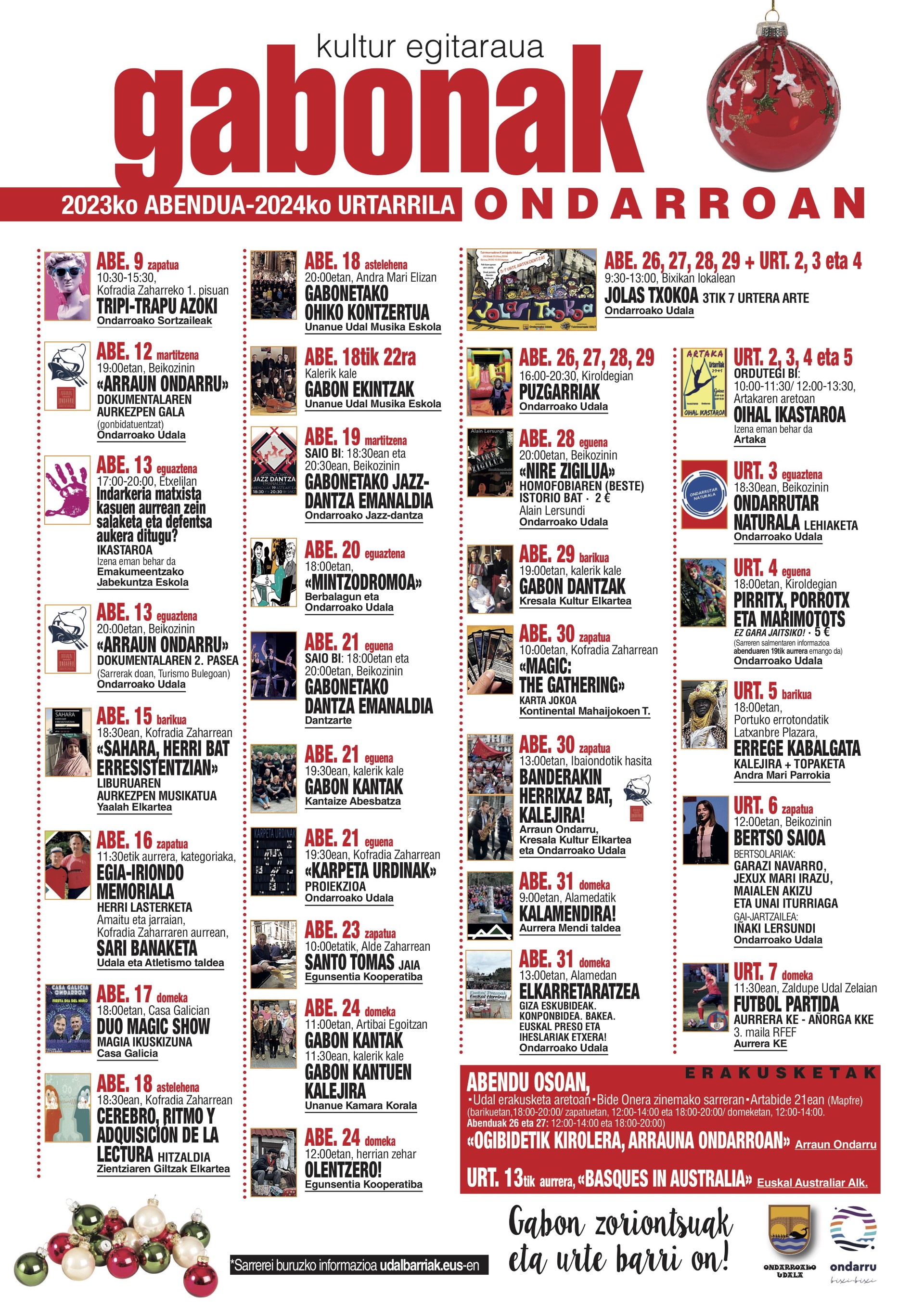 Honezkeo gexenok jasoko zenduen etxitan udalak ata daben Gabonetako egitarau, Abenduan 9xan hasi eta Urtarrillak 7 bittartin herrixan eukikouzen ekitaldixak agertzen diz bertan. Danetik eukikou, kontzertuk, dokumentalak, jolasak, dantzak, magia ikuskizunak, herrri lasterketi, erakusketak…ia gustoku dozuen!