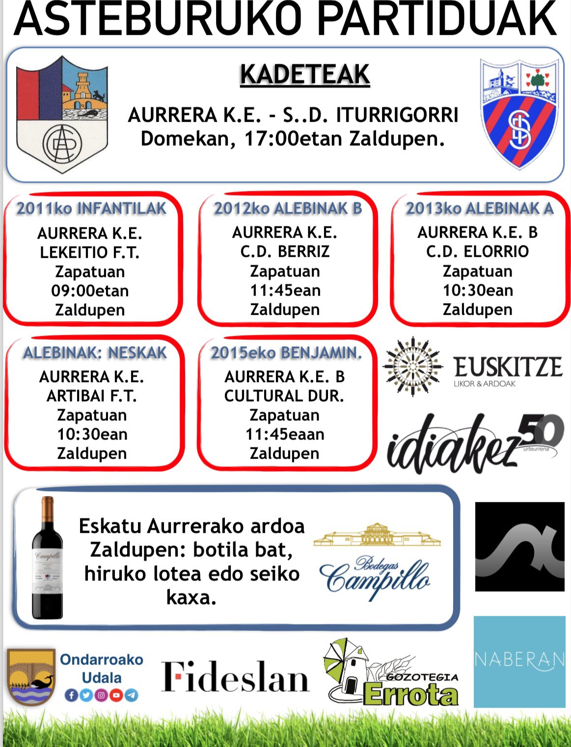 Honek diz astebukaera honetan AURRERA K.E. talde desbardiñak Zaldupe udal futbol zelaxan jokatuko dotxuen partidun egun eta ordutegixak. Aupa AURRERA TRA KA TRA!