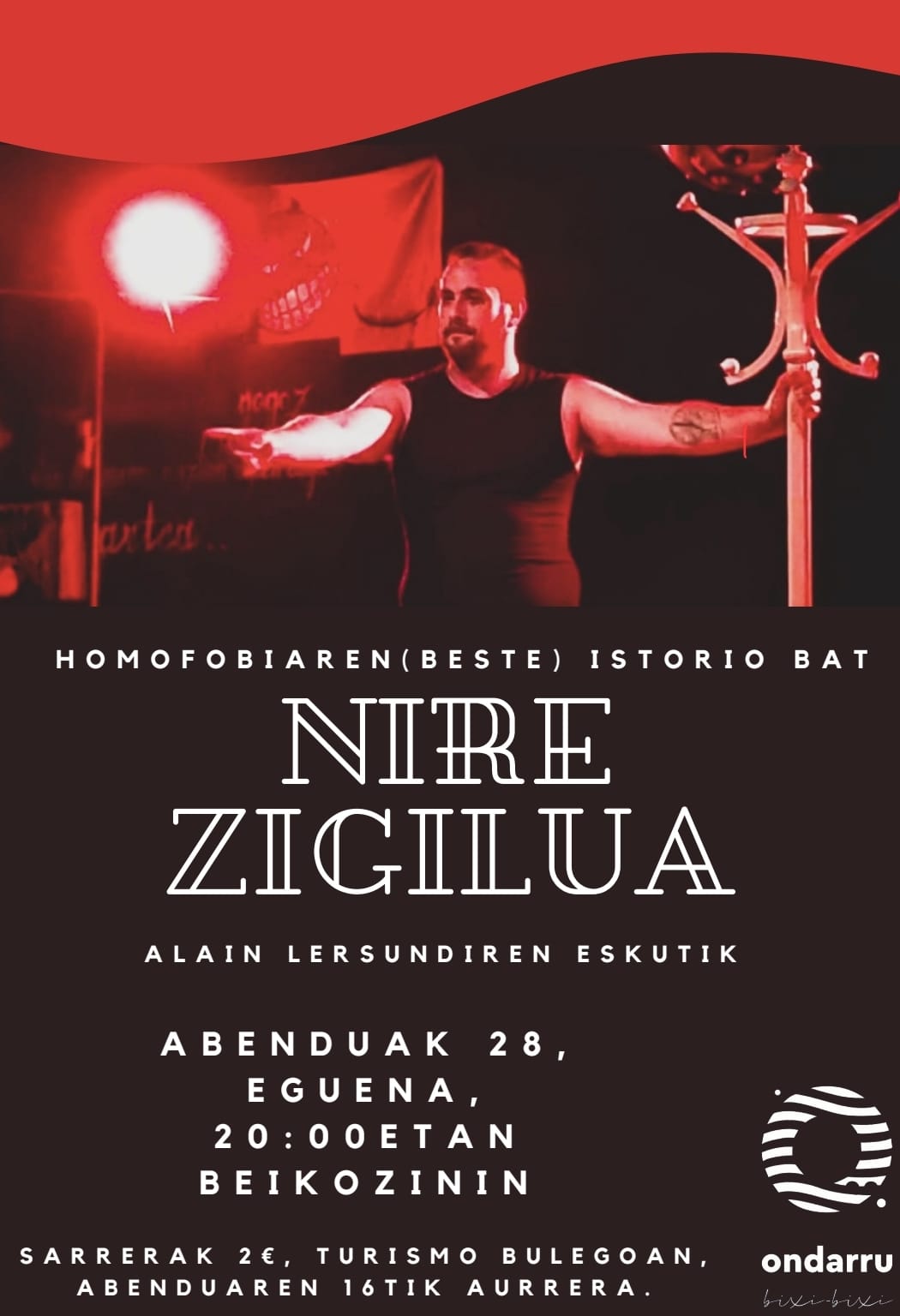 ALAIN LERSUNDI artista Ondarrutarrak antzeztuko dau datorren eguenin (A-28) NIRE ZIGILUA Homofobiaren (beste) istorio bat, deitxutako antzezlana Beikozinin illuntzeko 8 retan. Ikusi nahi dozuenok Turismo bulegun hartu biko dozue sarrerak euro biren trukin.