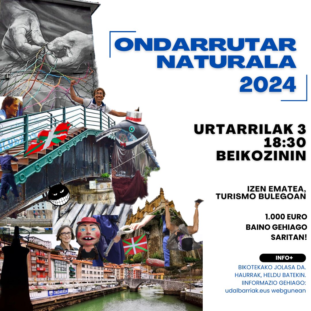 Hamen dator beste behin ONDARRUTAR NATURALAn lehiaketi. Aurten Urtarrillan 3 an ospatuko da Beikozini antzokixan arratsaldeko 6:30 xetatik aurrea. Bertan parte hartzeko ixenak Udal Turismo bulegun emon bihir diz eta 1.000 euro baino gexaua banatuko dabe sarixetan. Anima eta hartu parte!