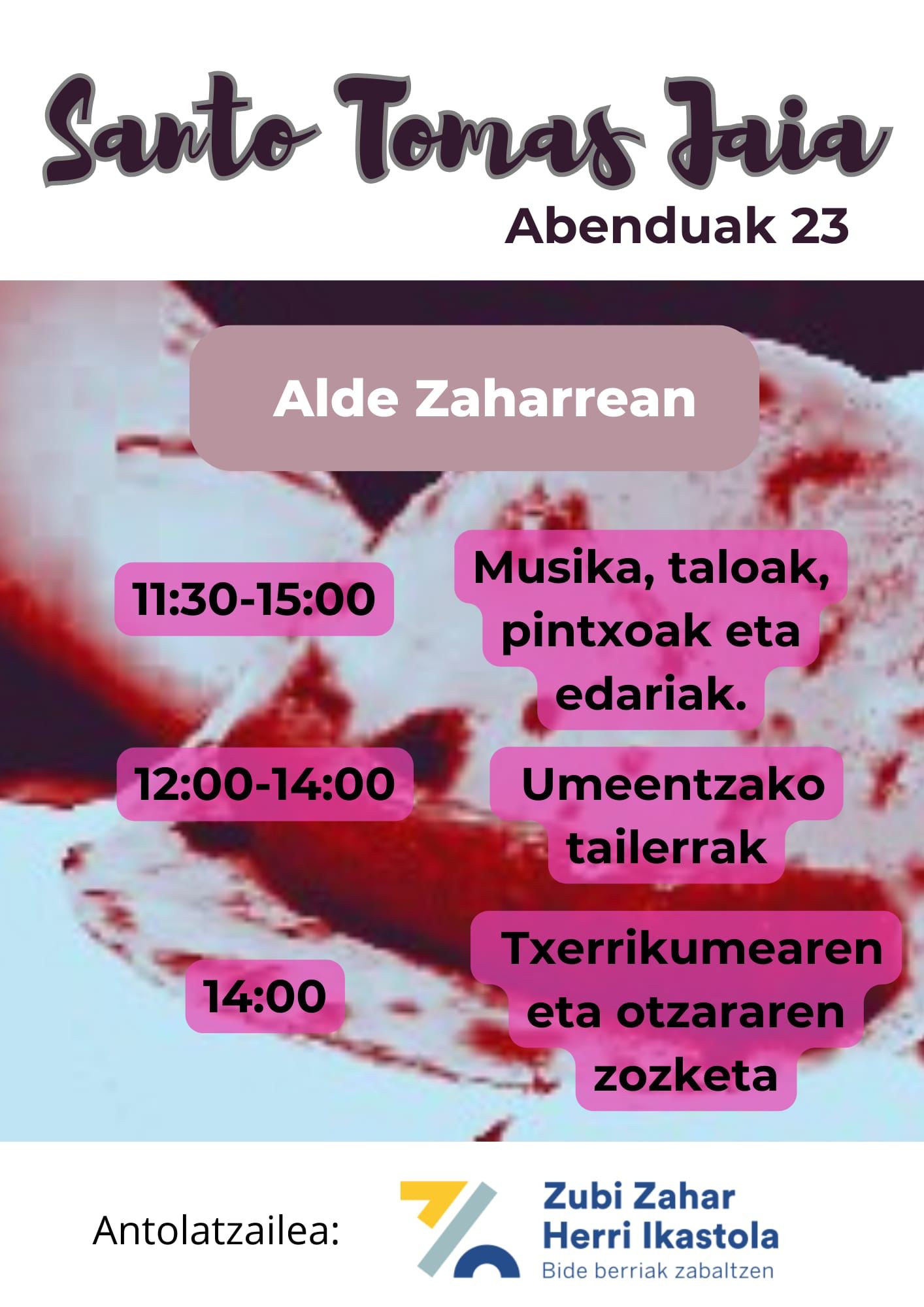 ZUBI-ZAHAR herri ikastolik antolatute, SANTO TOMAS jaxe ospatuko da Alde Zaharrin goxeko 11:30tatik aurrea. Txoixu, taluk, pintxuk, umintzako tallerrak, zozketi…lagunakin egun ederra pasateko goxi. Hurreatu Alde zaharrea!