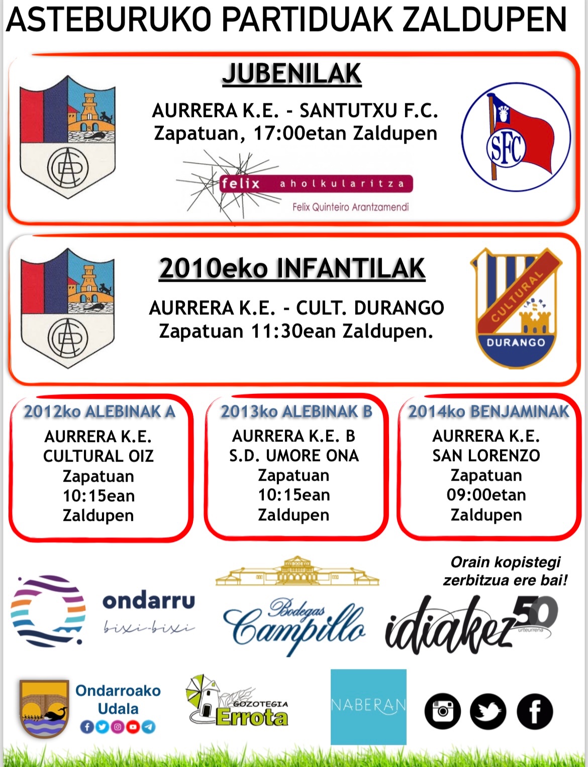 Honek ixango diz asteburu honetan Zaldupe udal futbol zelaxan AURRERAko talde desbardiñak jokatuko dotxuen partidun egun eta ordutegixak.