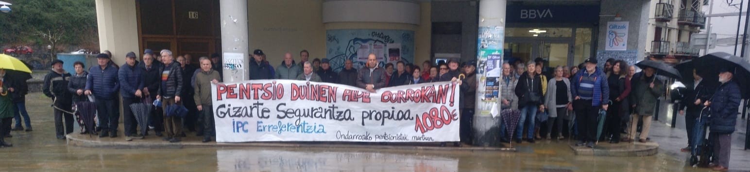 Eguraldi txarrai aurrea eiñaz Alamedan batu diz beste behin be herriko PENTSIONISTAK. Gaur Zumardi etxeko atarixan ikusi douz pankarta atzin ta antolatzallin arabera 125 lagun batu dizela esazku (tartin alkati eta bi zinegotzi). 20 minutuz egon diz bertan eta astin egon dizen barrixak entzun eta gero, datorren astin osteabe bertan batuko dizela baieztatu dosku. JO TA KE LORTU ARTE!