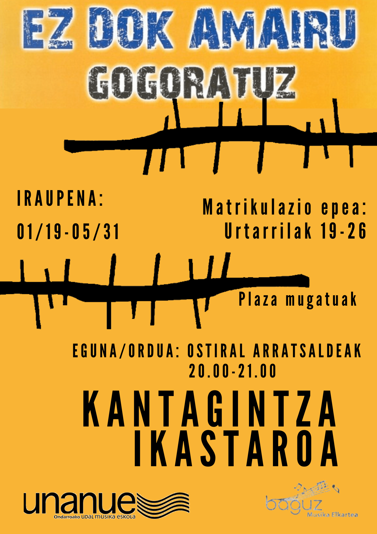 Nahizu kantagintza ikastarun parte hartu? Hamen dakazu aukera ederra. EZ DOK AMAIRU gogoratuz ekimena antolatu dau UNANUE udal musika eskolik. Lelengotik emon ixena, matrikulaziñoi epi ongoxe hillan 26 xan amaitzen da ta. Egurre eztarrixai!