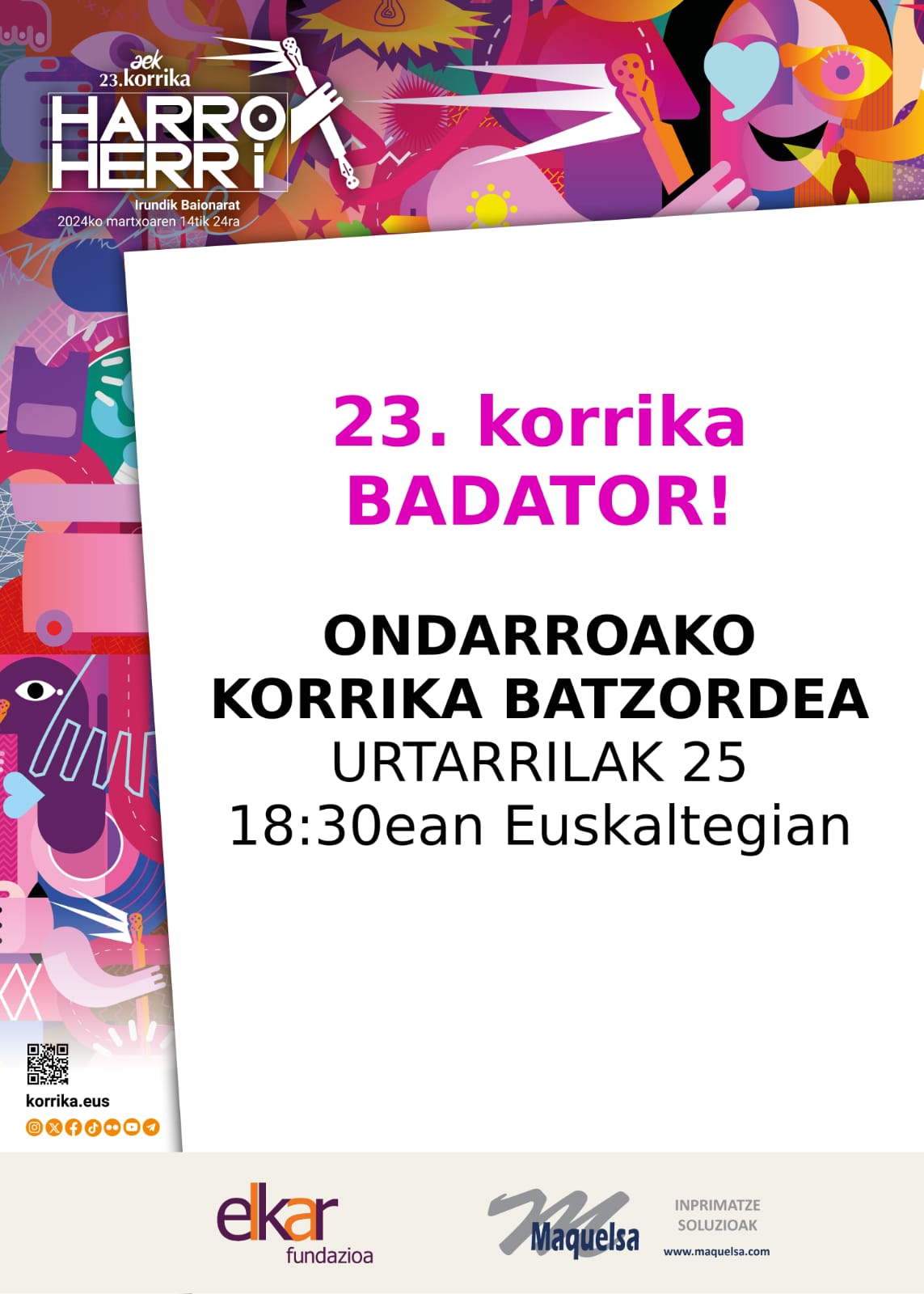 23.KORRIKA hurreatzen dun heiñin, herriko KORRIKA batzordin billerakin hasiko diz. Ongoxe eguenin (U-25) arratsaldeko 6:3o xetan Euskaltegixan (Kofrai Zaharrin) ixango da lelengoku, bertan herriko talde desbardiñan ordezkarixak batuko diz 23.KORRIKAn ingurun herrixan eingo dizen ekintzak antolatzeko. Hadi egon eingo dizen deialdixai!