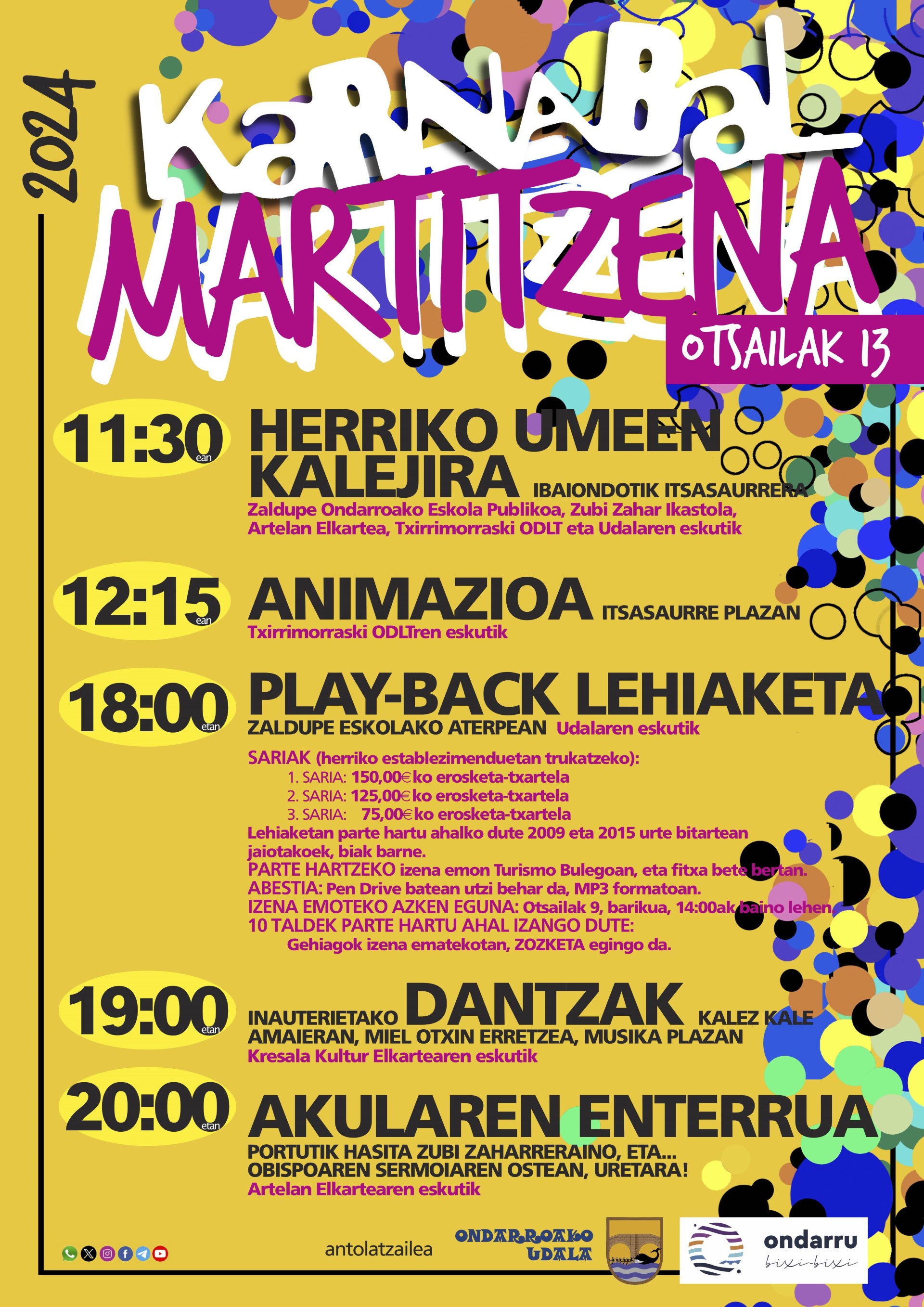 Onezkeo danok eukikozue prest mozorruk martitzen karnabalin kalejiran juteko. Udalak be, herrixan tzir altabozak prest laga dotxu ibilbidi alaitzeko doinu bidez eta egitarau oso bat prestatu dau egunak borobille urteteko. Akuliai agur esanaz amaitxuko diz aurten be IÑAUTEXAK. Gozatu egunaz!