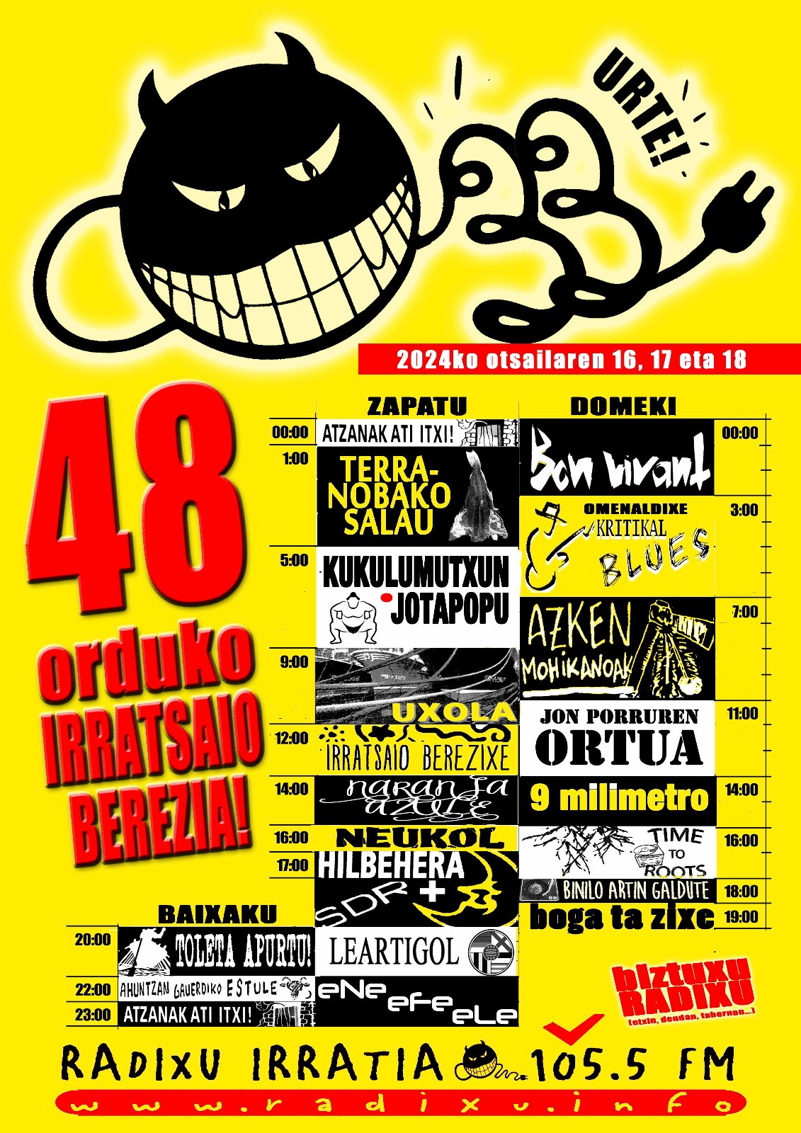 Urteroko ekimena antolatu dabe RADIXU irratikuk (105,5 fm) euran 33. urteurrena ospatzeko. Hasi otsailak 16 xan (baixaku) eta otsailak 18 (domeki) amatxu, RADIXU martxan eongo da 48 ordu jaraixin. Programa ezagun asko eta beste batzuk barrixauak ahalko dozue entzun bertan: Azken Mohikanu, Uxola irratsaixu, Bon vivant, Terranobako salau….Gogoratu internet bidez be ahalko dozuela entzun, http://www.radixu.info, kliklatu ostin. Zoixonak hamendik RADIXU etxen dozuen danoi!
