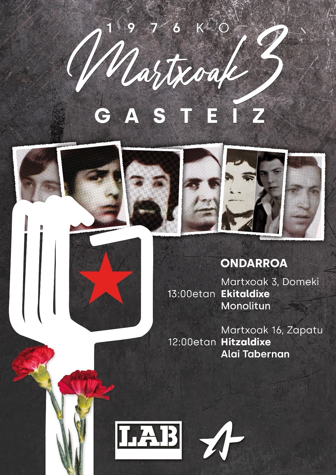 Urtero lez, Ondarruko LAB sindikatuk eta ERNAI gazte antolakundik 1976ko Martxoak 3an Gasteizen polezixik eraildako langilik omentzeko ekitaldixe antolatu dabe. Gaur (Martxoak 3) 13:00etan Monolitun.