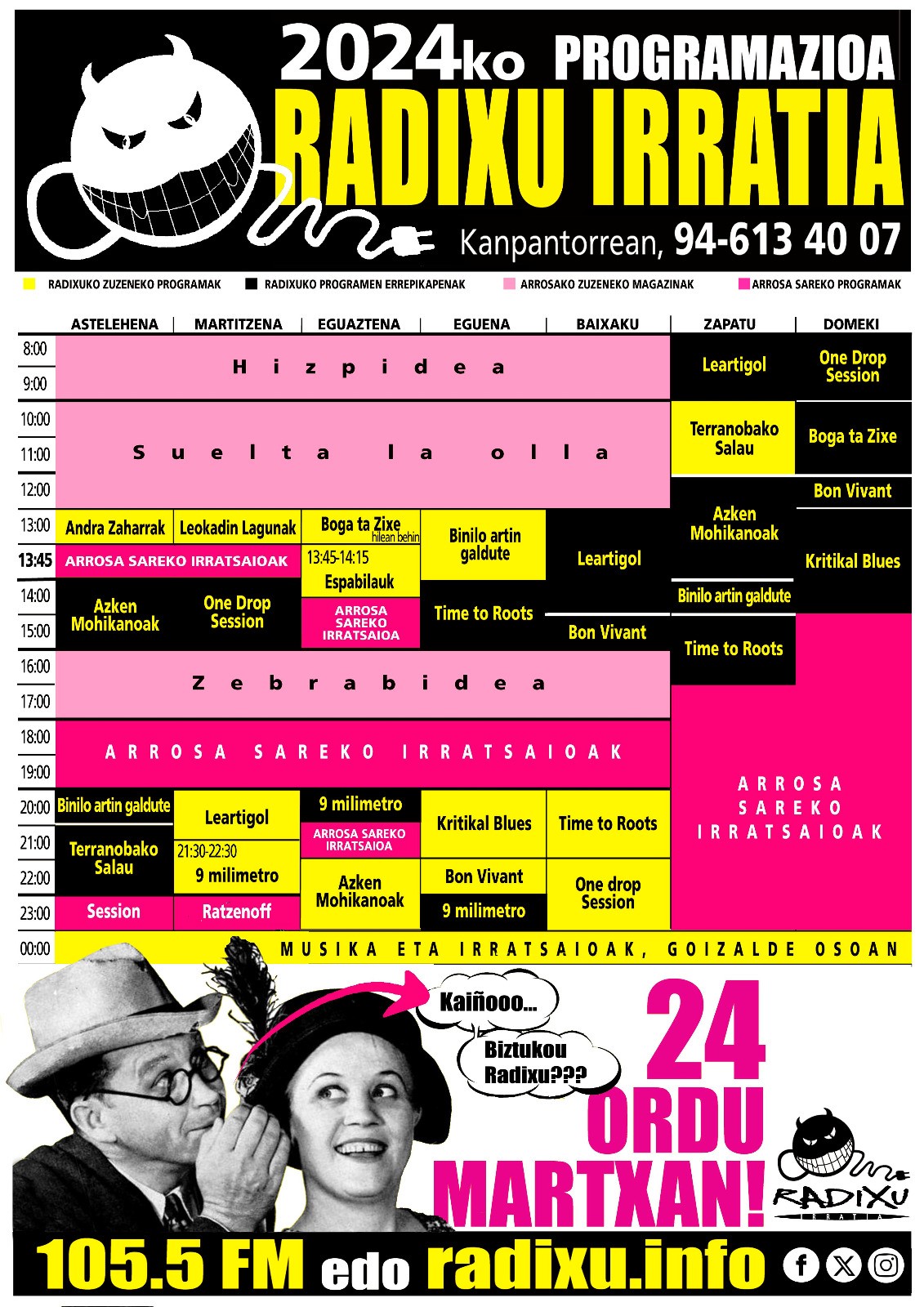 RADIXU irratixak zabaldu dau 2024an tzir eingo daben programan banaketi. Musika ona entzuti gustoko badozu edo albiste interesgarrixak entzuteko gogoz bazabiz, kirola gustoku bazu…. zure aukeri, RADIXU 105,5 fm edo radixu.infon bitxartez. Edozer zalantza argitzeko, 946134007 telefonu be hor da. Gozatu belarrixak!