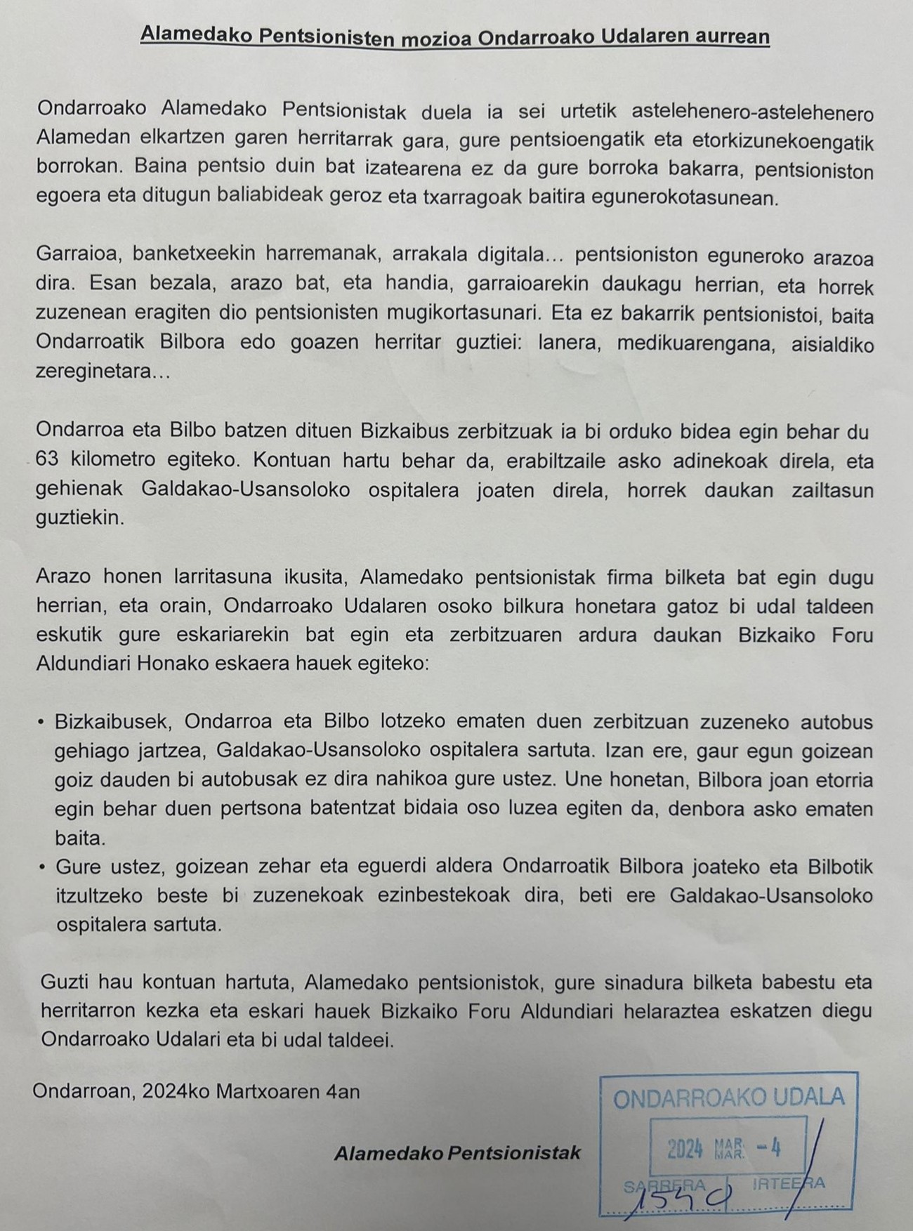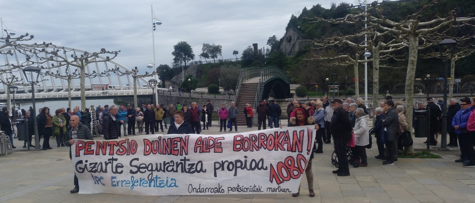 Eguraldixak bakin lagatze gaur herriko PENTSIONISTAi.12 xak puntun batu diz pankarta atzin, gaur 127 lagun egon eidiz esazku antolakuntzatik (tartin alkati eta hiru zinegotzi). 20 minutuz egon diz Alamedan eta informaziñoi lez argitxu dabe gaur bertan 3.141 herrittarren siñadura aurkeztu dabela udaletxin, zuzeneko autobusak lortzeko bai Bilboa juteko eta batxe be Galdakaoko ospitxalea.