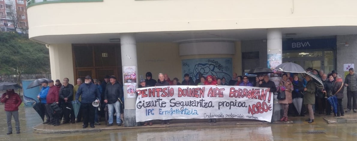 Euri zaparrarai aurrea eiñaz, Alamedako aterpin zabaldu dabe gaur eguerdixan pankarti herriko Pentsionistak. Gaur 105 lagun egon eidiz esazku antolakuntzakuk, ta datorren astin be han eongo dizela baieztatu dozku. IPC erreala, 1080 euro bakotxantzako, Genero arrakalaik ez egoti…Zein eon leike eskakizun horren kontra? Zahartza duin bat eruteko gutxieneko baldintzi ixan biko litxake. Danok ikutu etxen gatxun arazu de, gero negar etxik ez dau balixo. Borrokan etxi merezi dabelako, Jo ta Ke LORTU ARTE!