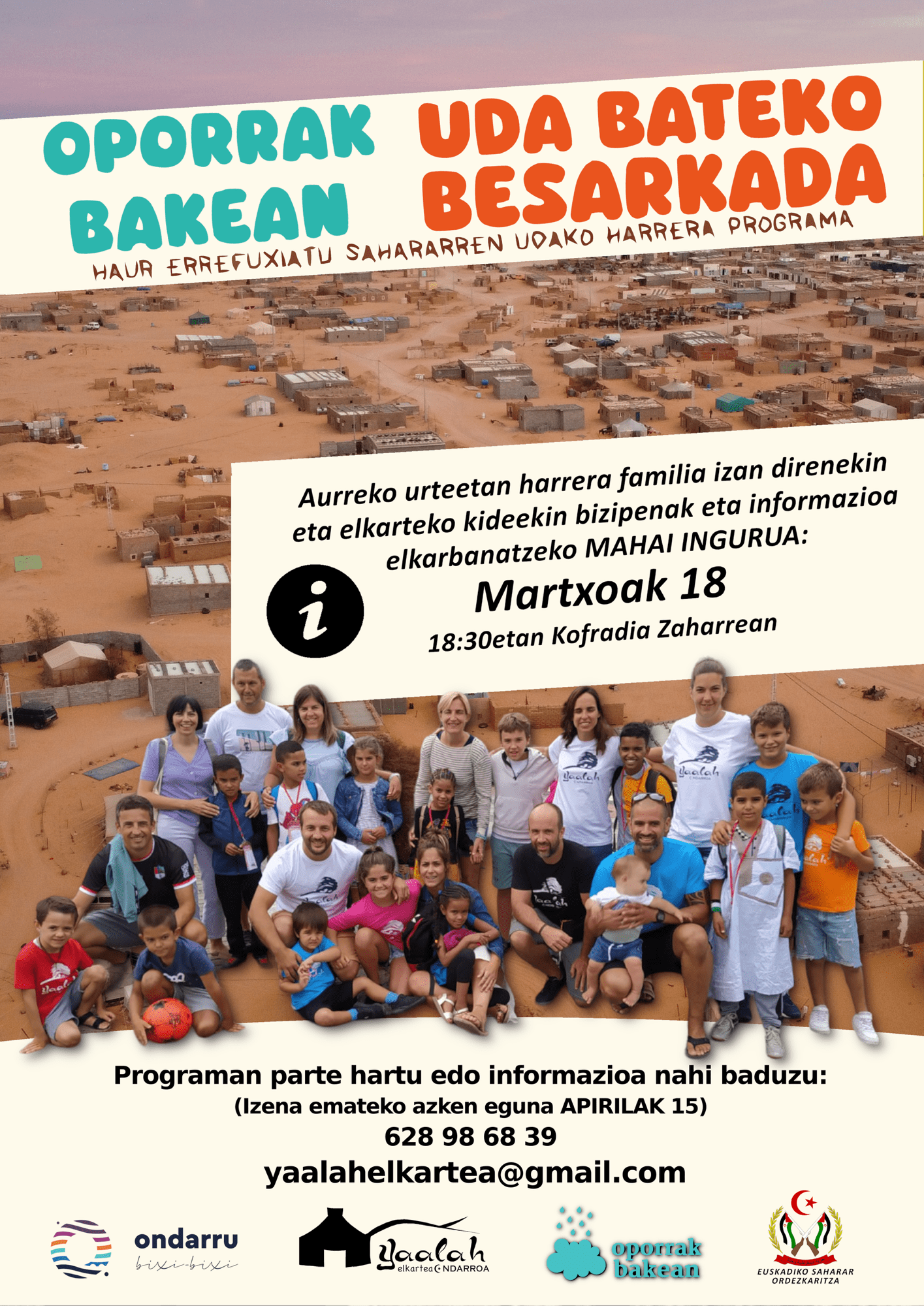 Martxan da Oporrak Bakean programin kanpaini. Saharar errefuxiatun kanpamentutako umik udako hile bi Euskal Herrixan pasati posible etxen daben programi.