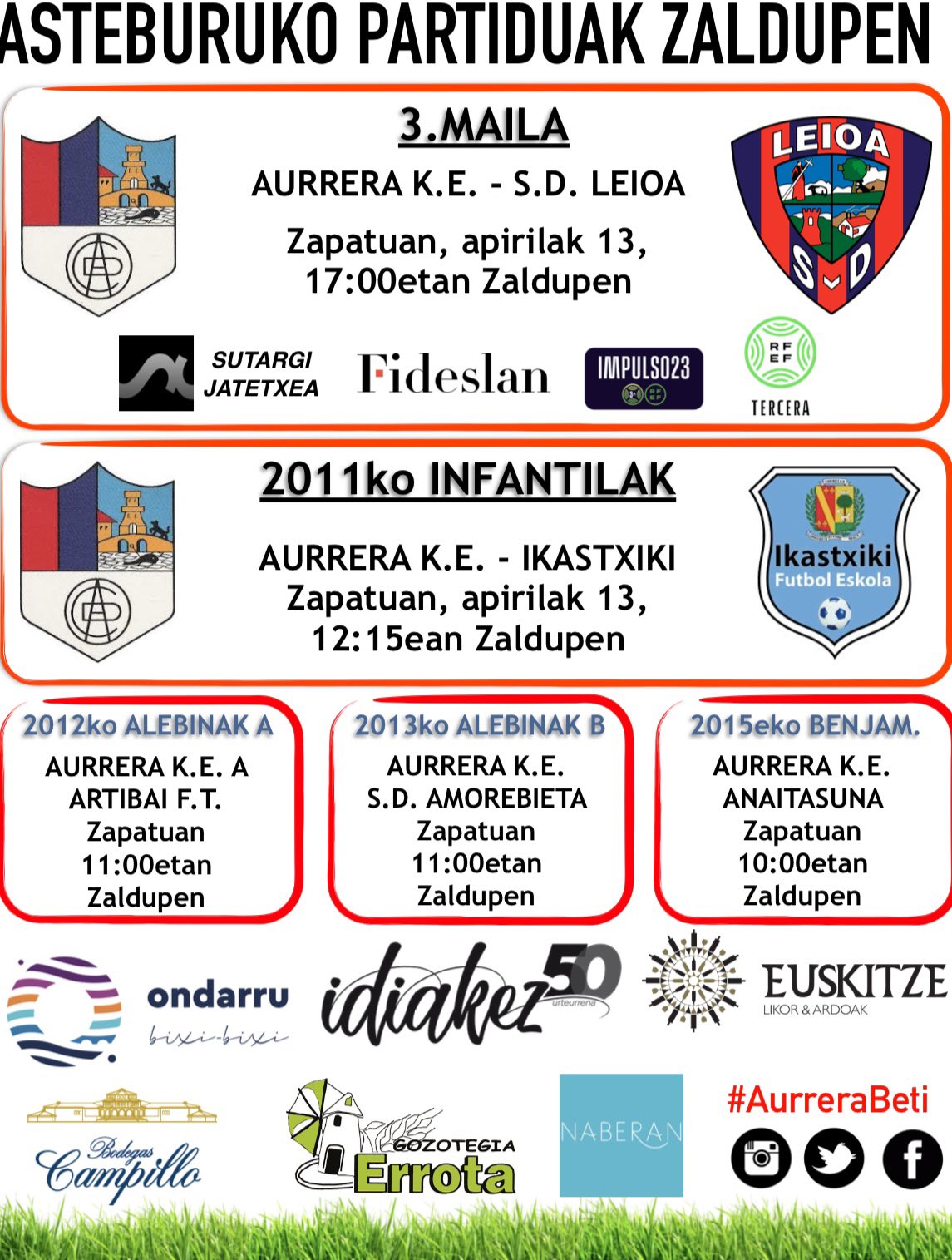 Honek diz astebukaera honetan AURRERA K.E. talde desbardiñak Zaldupe udal futbol zelaxan jokatuko dotxuen partidun egun eta ordutegixak. Aupa AURRERA TRA KA TRA!