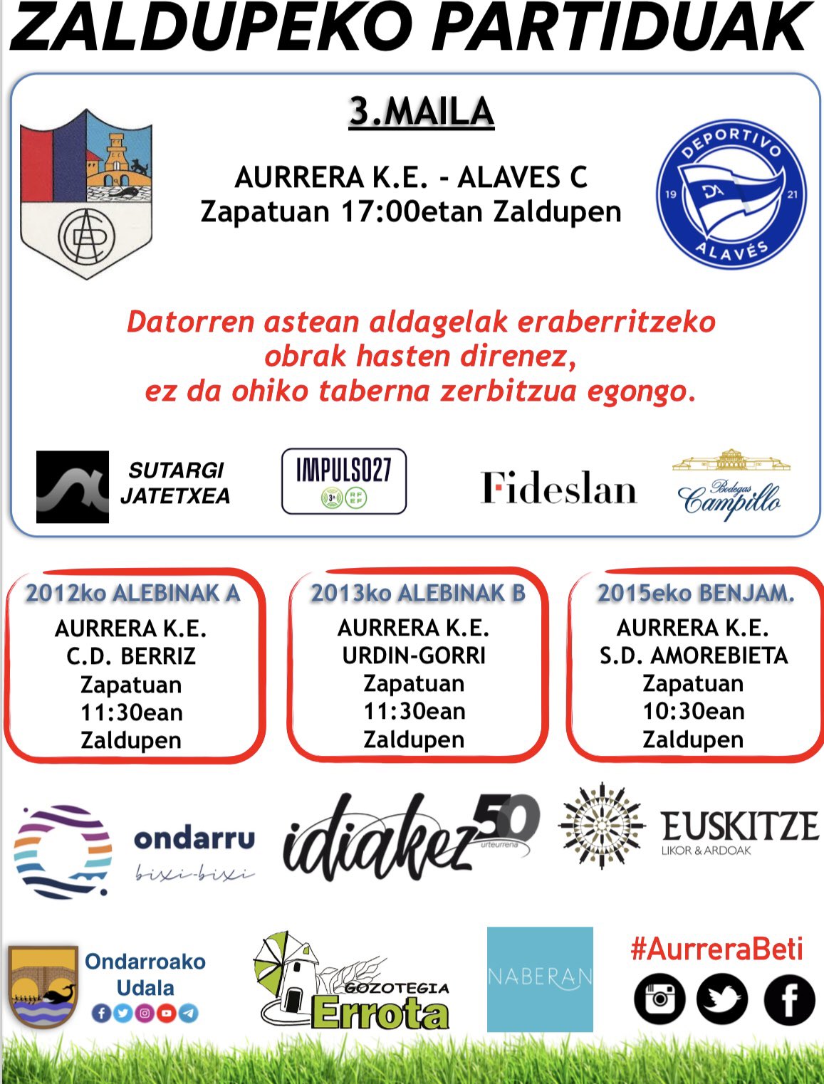 Honek diz asteburo honetan AURRERA K.E talde desbardiñak Zaldupeko udal futbol zelaxan jokatuko dotxuen partidun egun eta ordutegixak.