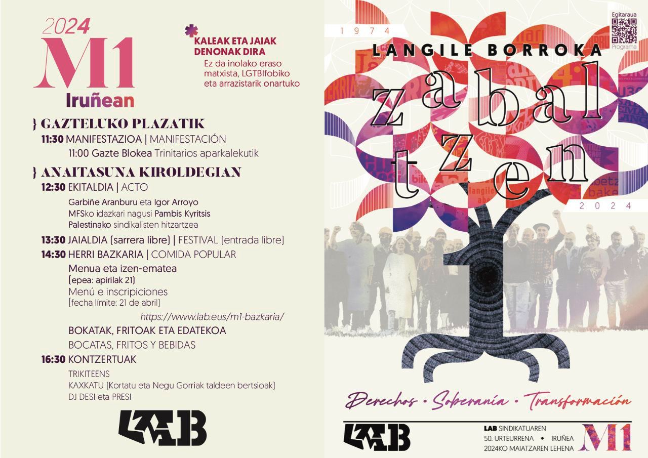 LANGILE BORROKA ZABALTZEN! Eskubidik-Subirotasune- Aldaketi, lelopin ospatuko dau L.A.B sindikatuk Iruñan aurtengo Maiatzak 1a. Badalako zertaz borrokatu: lan baldintza duiñak,estabilidadi,…batu zeube borroka. Aurtengo Maiatzak 1a berezixe ixango da, 50 urte betetetxulako L. A. B. sindikatuk eta manifestaziñoin ostin ekitaldi bat eingo dau Anaitasuna kiroldegixan. Herritxik autobuse ata dabe berta juteko, azpixan dakazue egitarau.